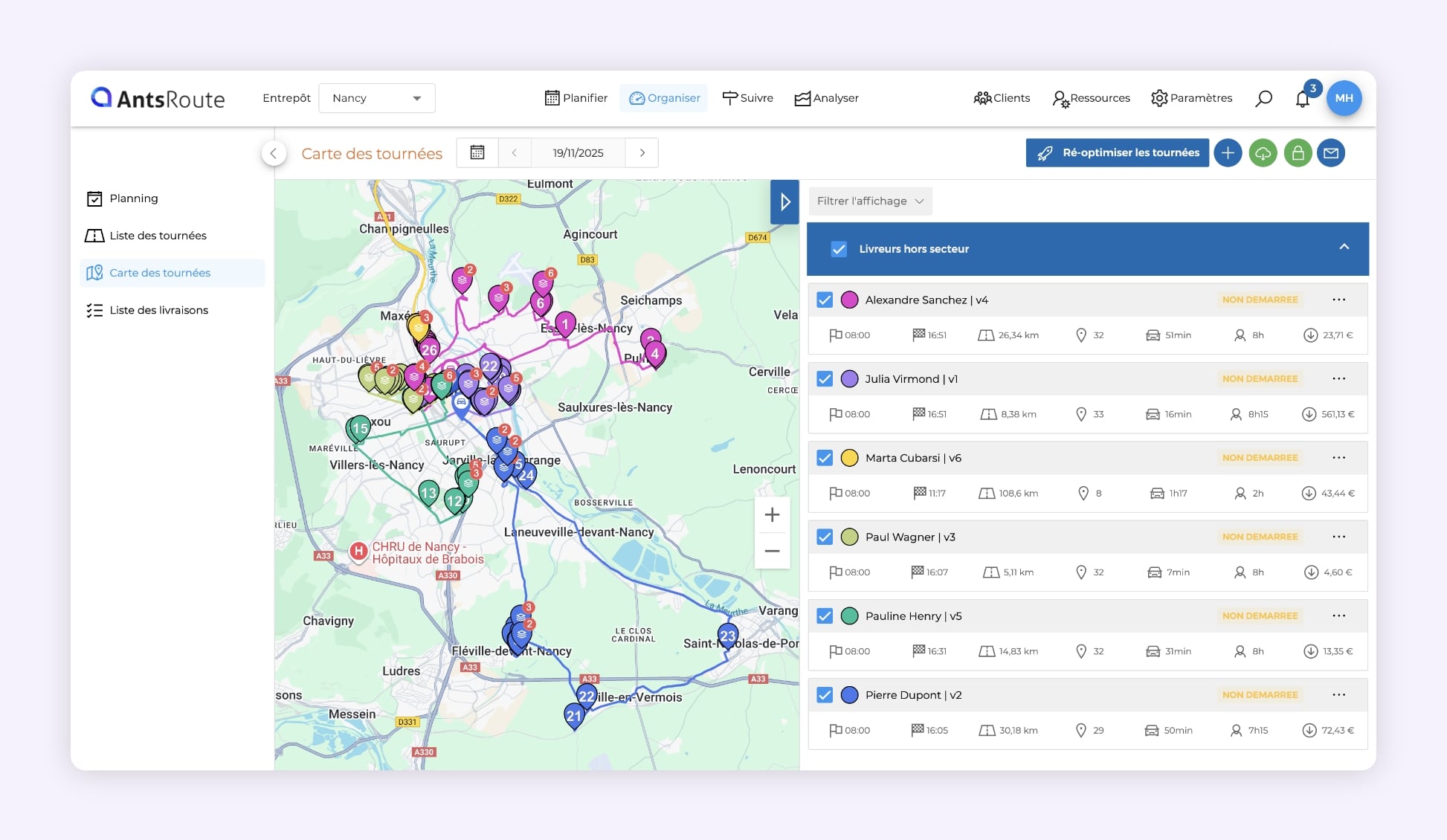 C’est là, une fois de plus, que la technologie entre en scène, et plus précisément notre logiciel AntsRoute. Il permet de rééquilibrer les charges de travail, éviter les doublons et de redistribuer automatiquement les trajets en cas d’imprévu. Un chauffeur absent ? Le logiciel adapte les tournées. Un client urgent ? L’itinéraire se recalcule instantanément, sans tout recommencer.