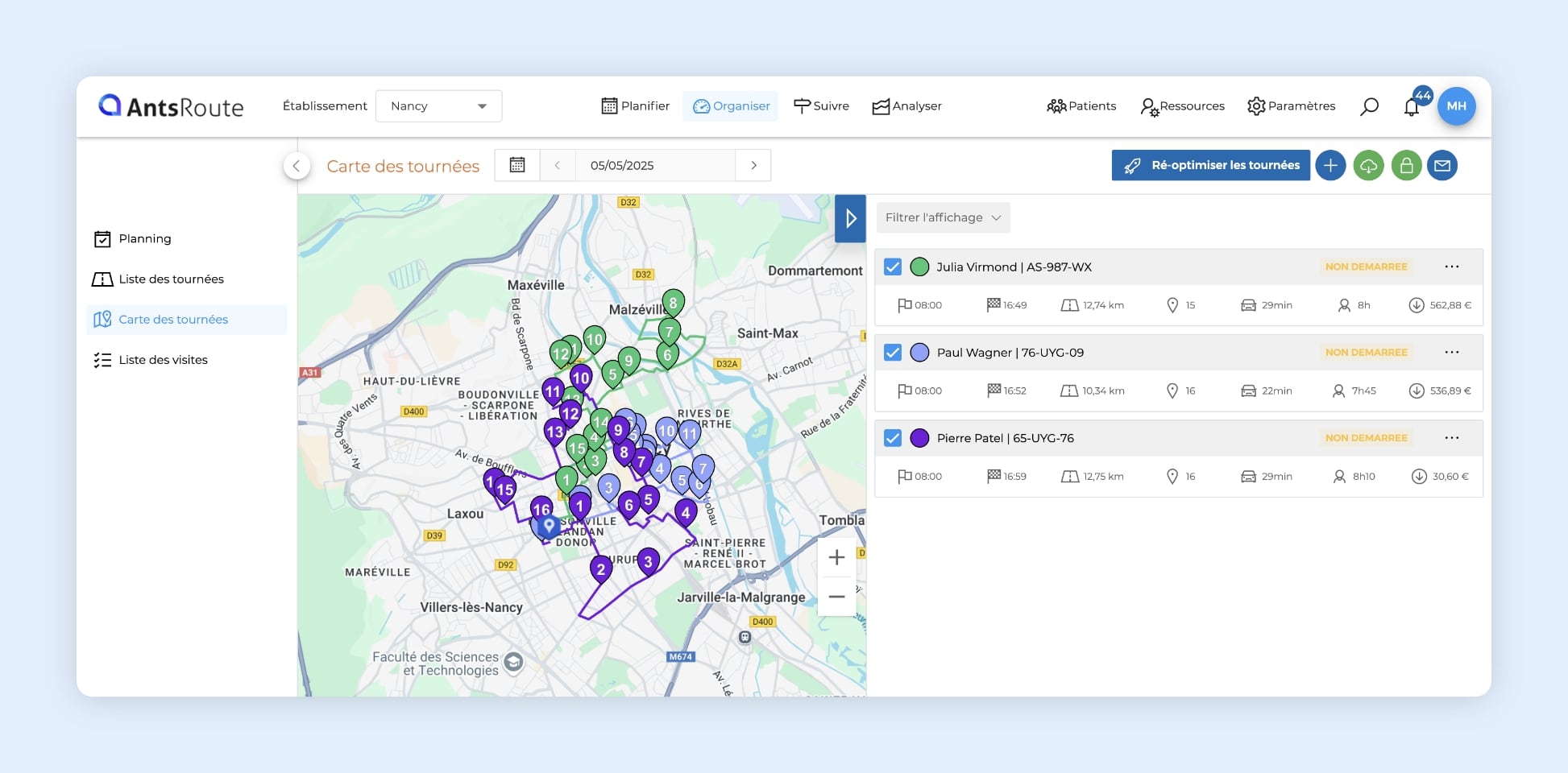 Des solutions comme l’application AntsRoute utilisent des algorithmes pour créer des tournées optimisées et réduire le temps passé sur la route entre chaque patient. Ils prennent en compte les temps de trajet et de soin, mais également le trafic en temps réel, pour optimiser le planning de tournées et le réadapter selon les contraintes réelles de circulation.
