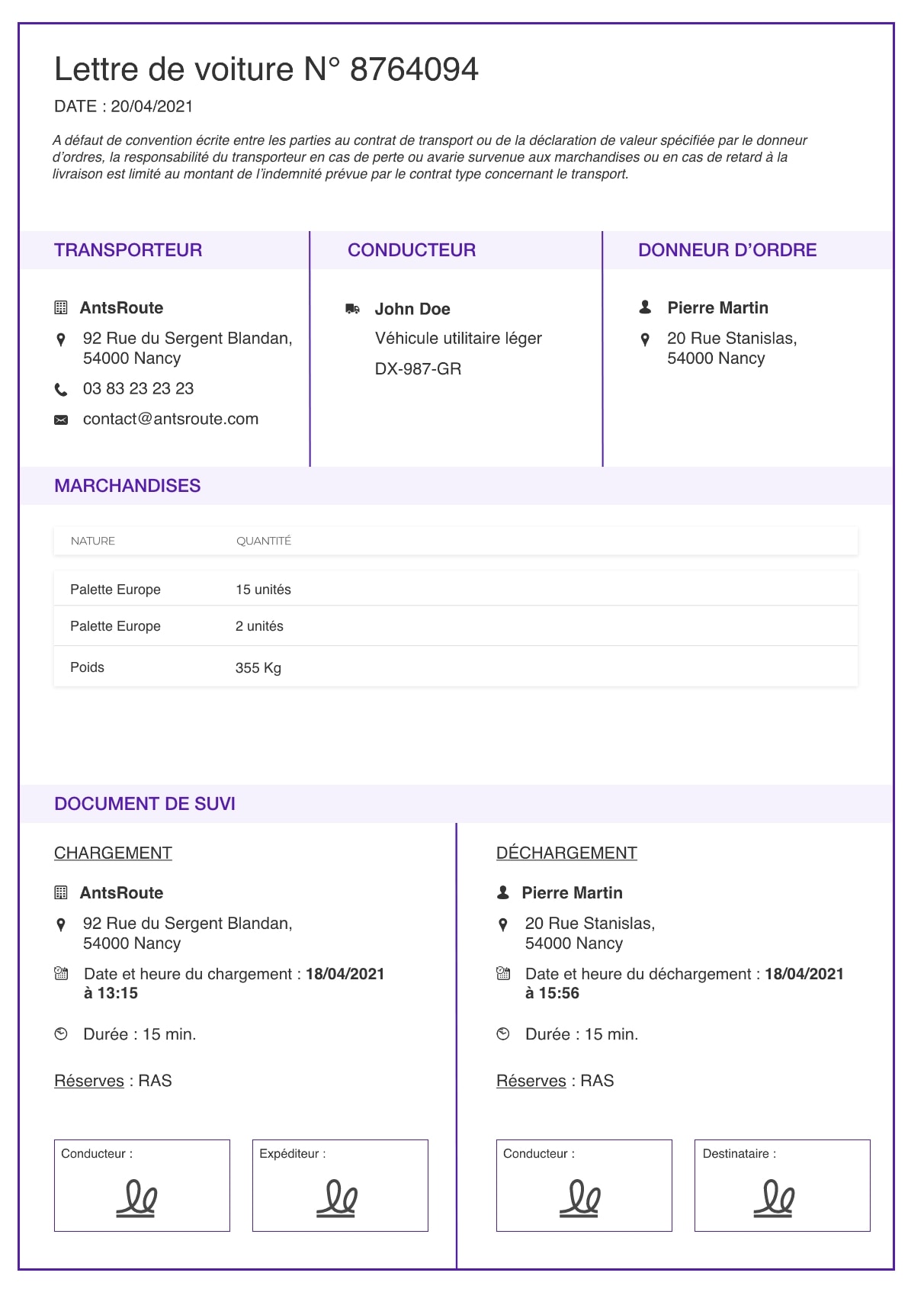 Une lettre de voiture électronique générée avec le logiciel AntsRoute.