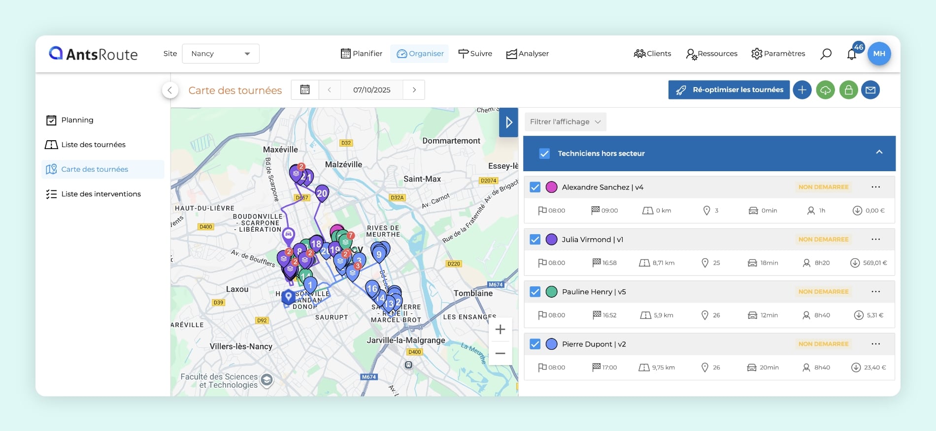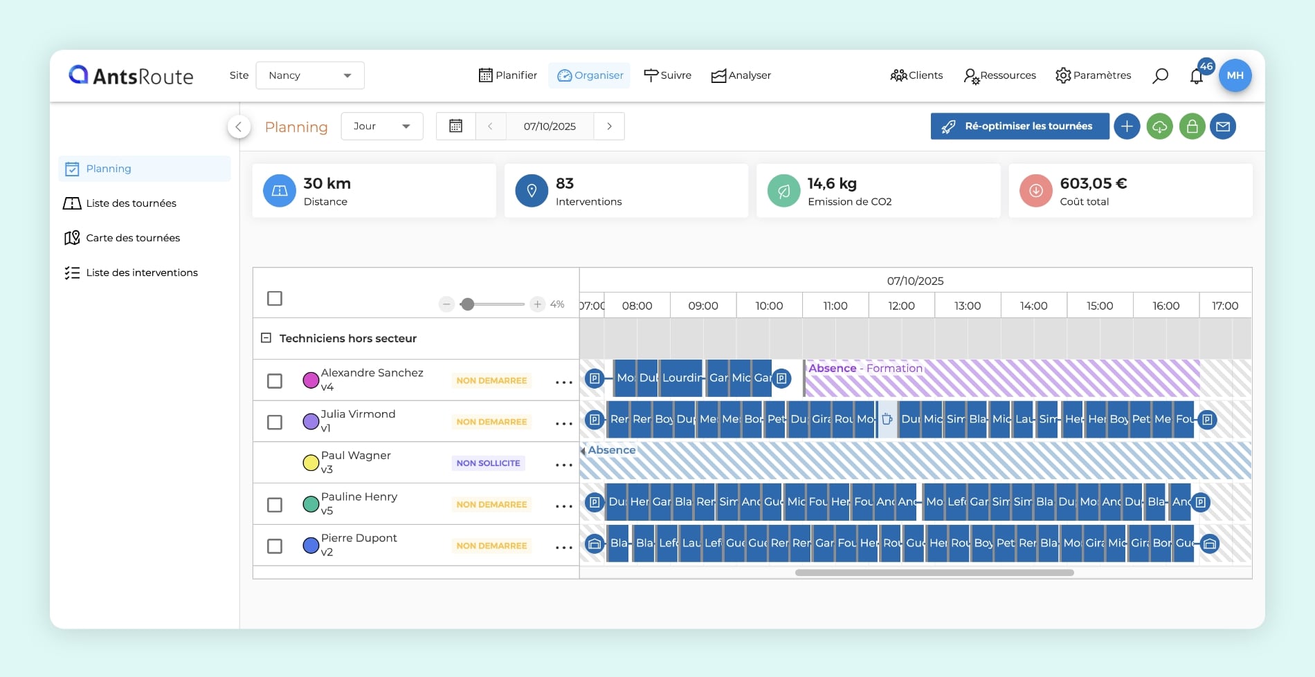 En parallèle, AntsRoute équilibre la charge de travail : fini les journées où Julien enchaîne dix interventions pendant que Sarah en effectue trois. Résultat :