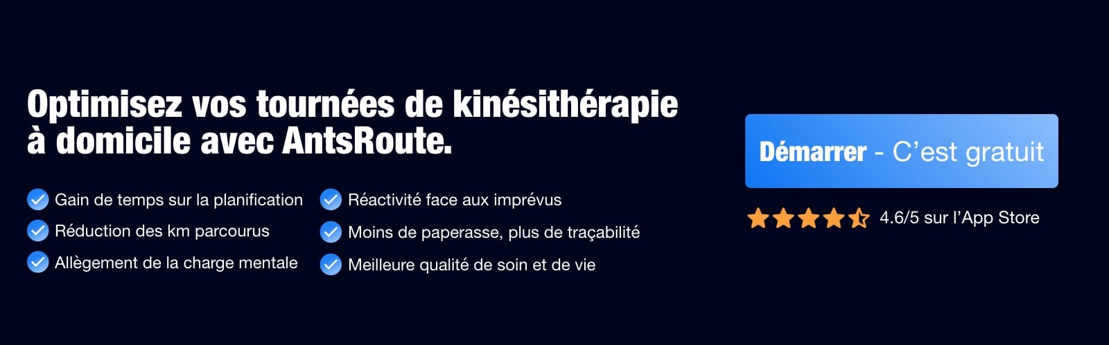En résumé, le bon logiciel, c’est celui qui vous fait gagner du temps en répondant à vos réels besoins. Si vous voulez tester une solution pensée pour les kinés de terrain, pourquoi ne pas essayer AntsRoute ? La démonstration se fait en 2 minutes, et l’abonnement démarre à 17 €/mois. »
