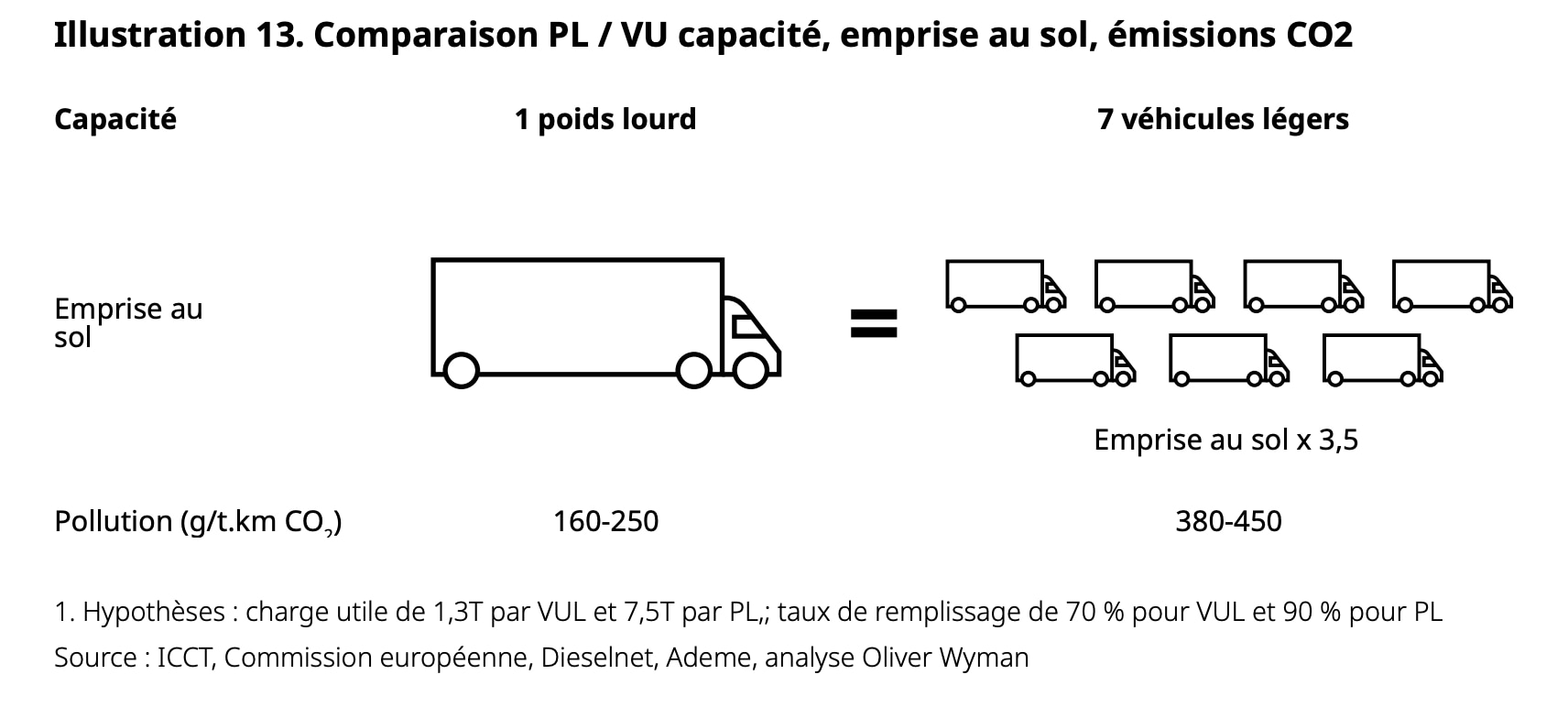 Comparaison PL / VU capacité, emprise au sol, émissions de CO2 par Olivier Wyman.