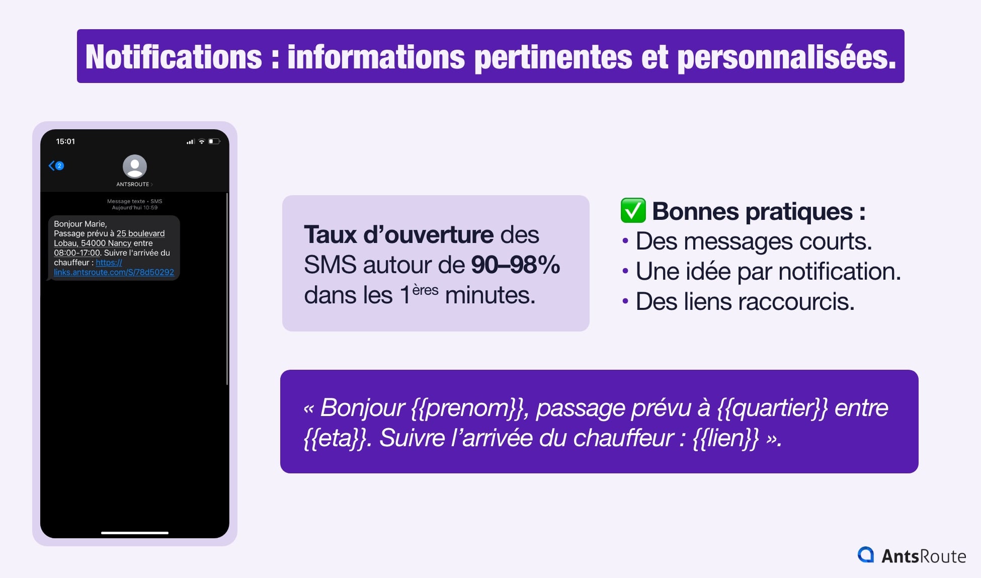 Par exemple: « Bonjour {{prenom}}, passage prévu à {{quartier}} entre {{eta}}. Suivre l’arrivée du chauffeur : {{lien}} ».
