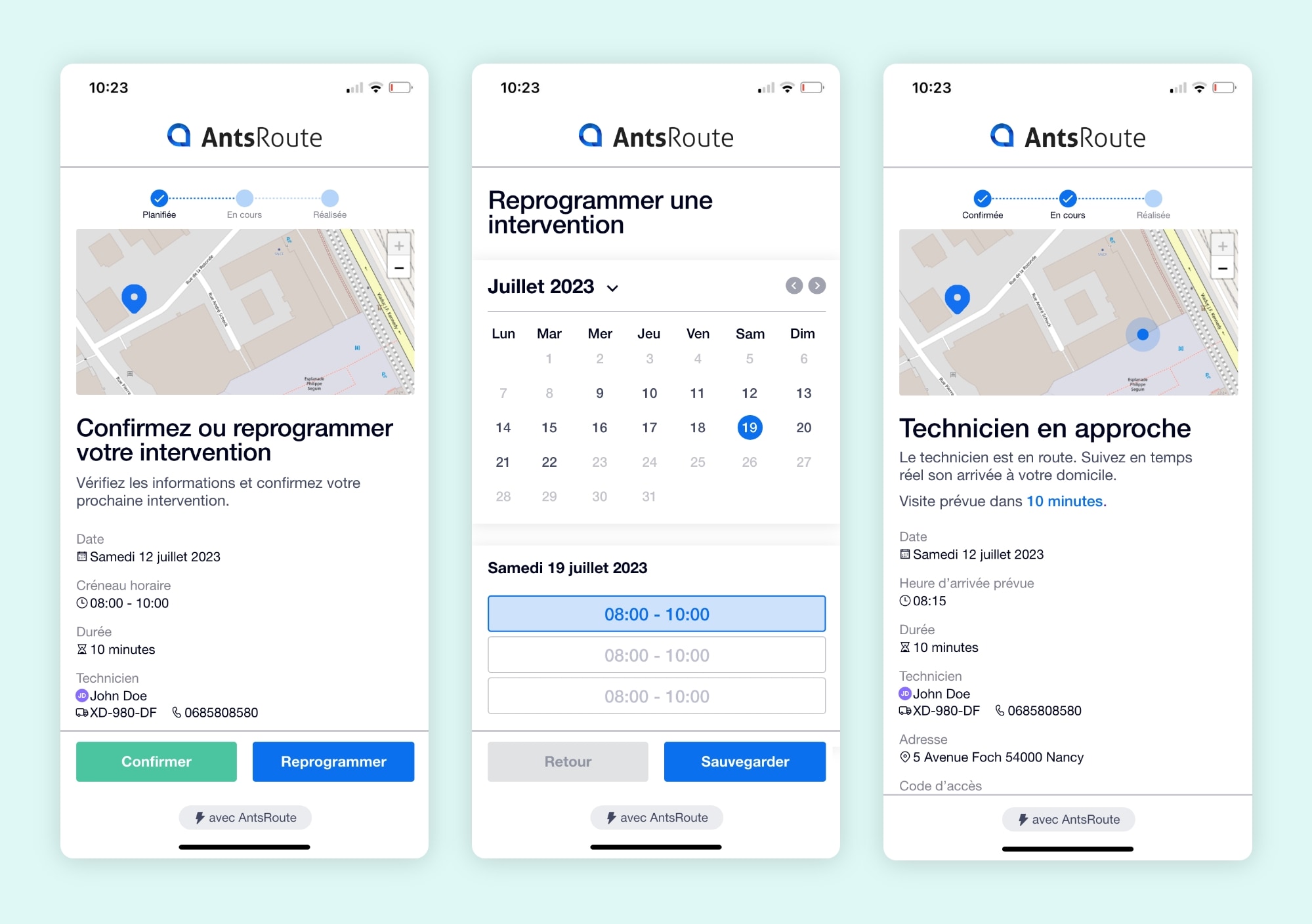 - De plus, un outil comme AntsRoute permet d’envoyer au client un lien pour lui permettre de confirmer ou reprogrammer lui-même un créneau horaire de passage en cas d’indisponibilité. Cette solution est très efficace pour prévenir les rendez-vous manqués.