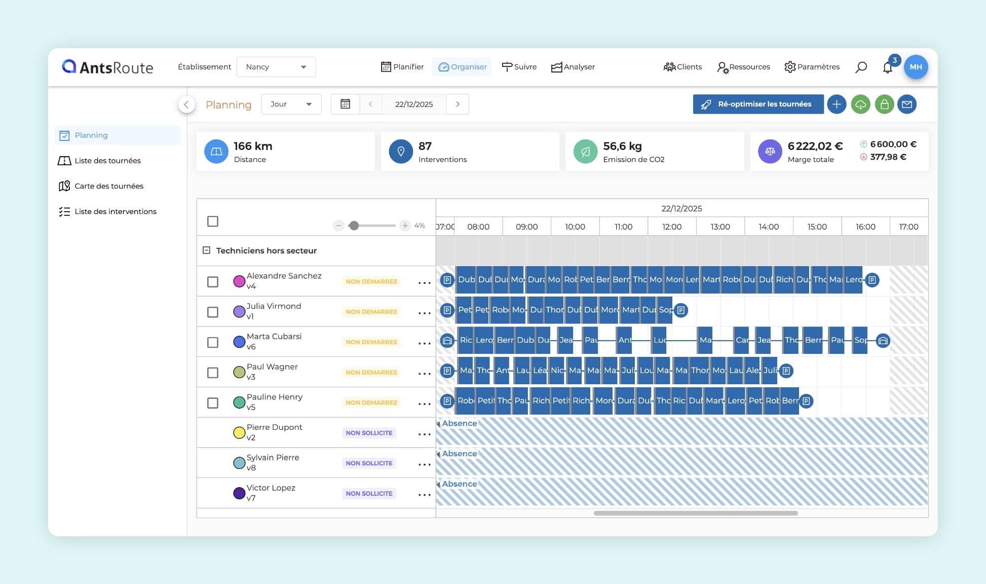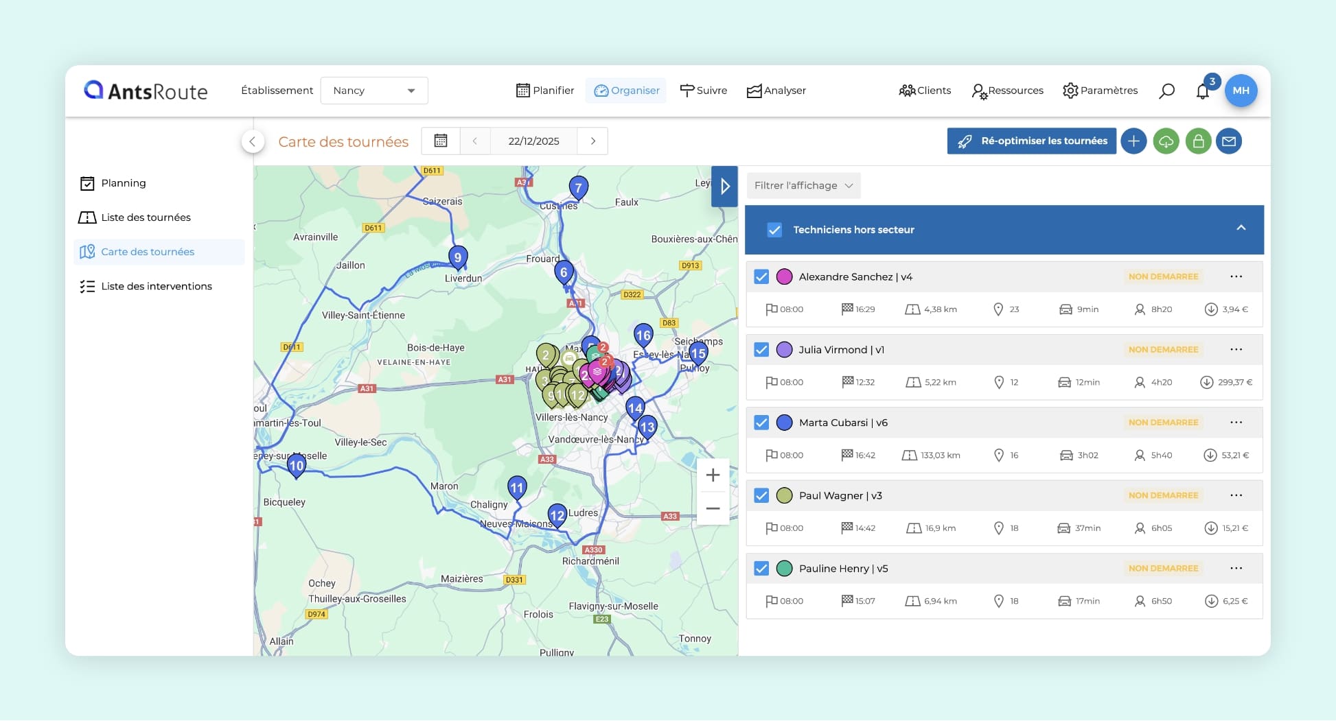 AntsRoute analyse en quelques secondes ce qu’un planificateur humain mettrait des heures à organiser : trajets, créneaux disponibles, compétences des techniciens, durées d’interventions, stock embarqué…