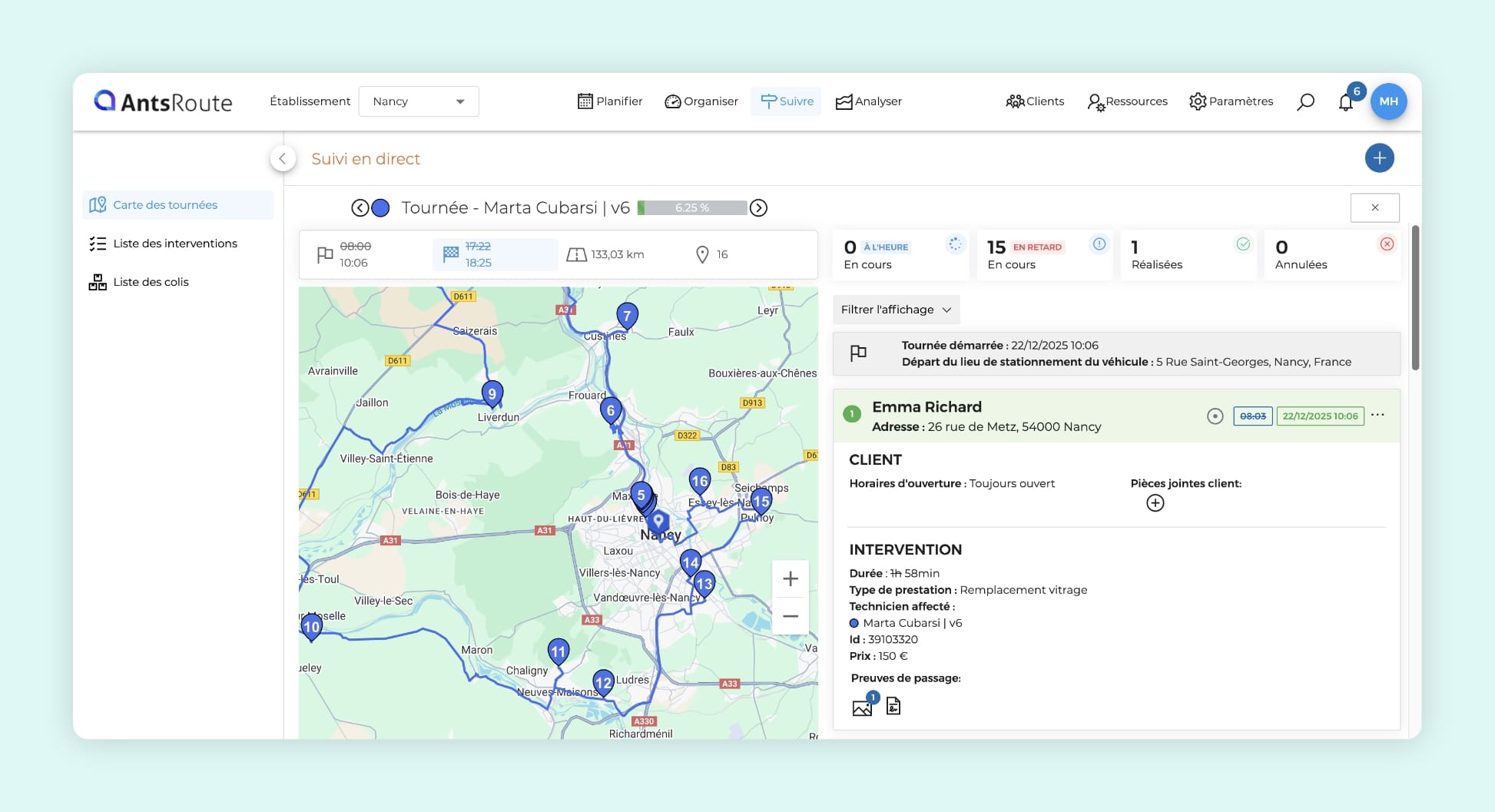 Avec AntsRoute, votre tournée se réorganise instantanément :