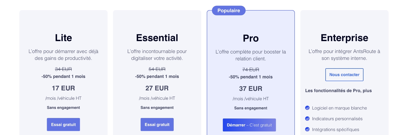- Faible coût initial (abonnement mensuel ou annuel, à partir de 34€/mois par véhicule chez AntsRoute).