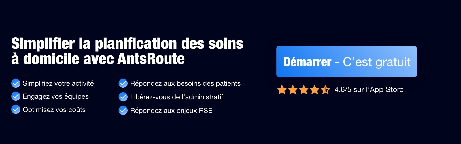 Pour optimiser gratuitement vos tournées de soins à domicile pendant 7 jours, rien de plus facile. Inscrivez-vous simplement sur cette page, sans engagement ni numéro de carte bleue, et découvrez tous les services d’AntsRoute dans les meilleures conditions !