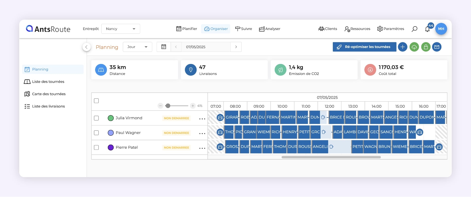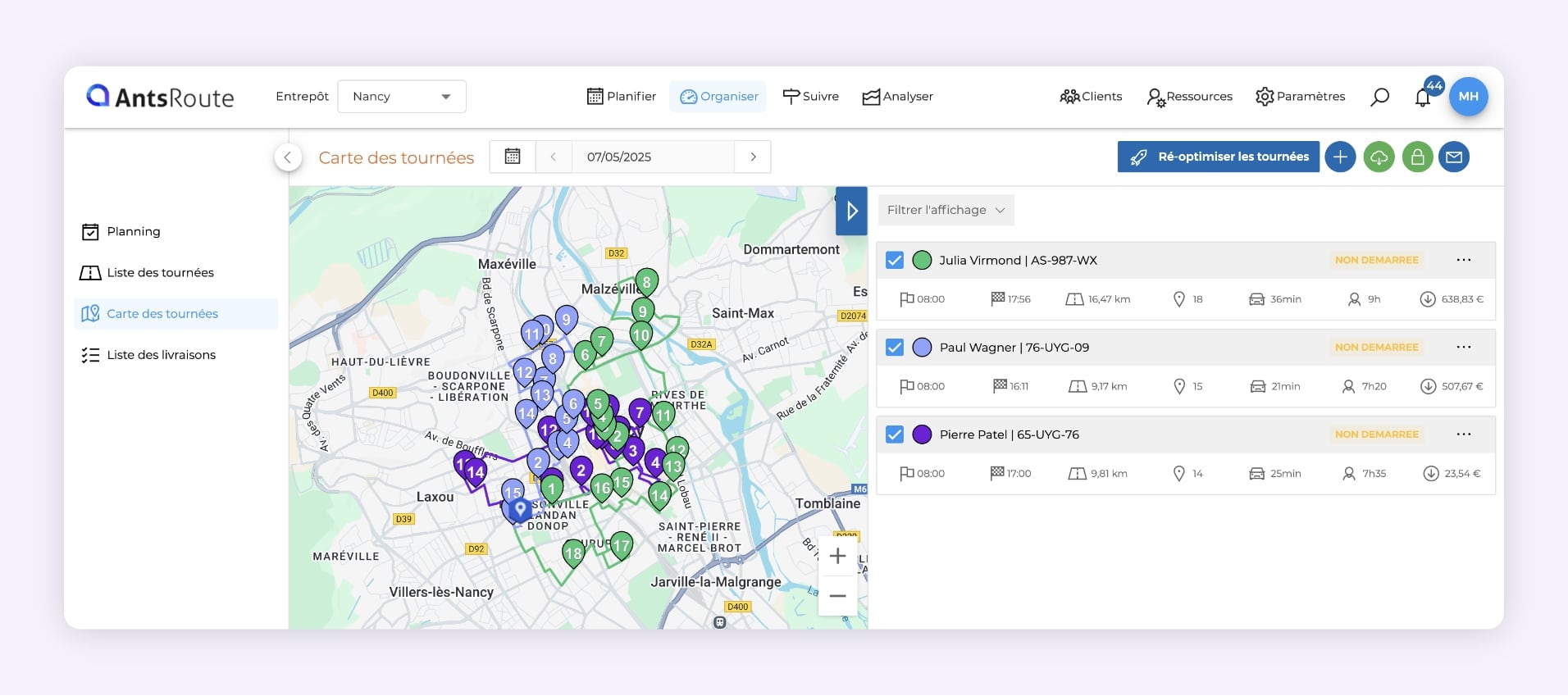 - Générer les tournées en quelques clics selon vos contraintes et priorités.
