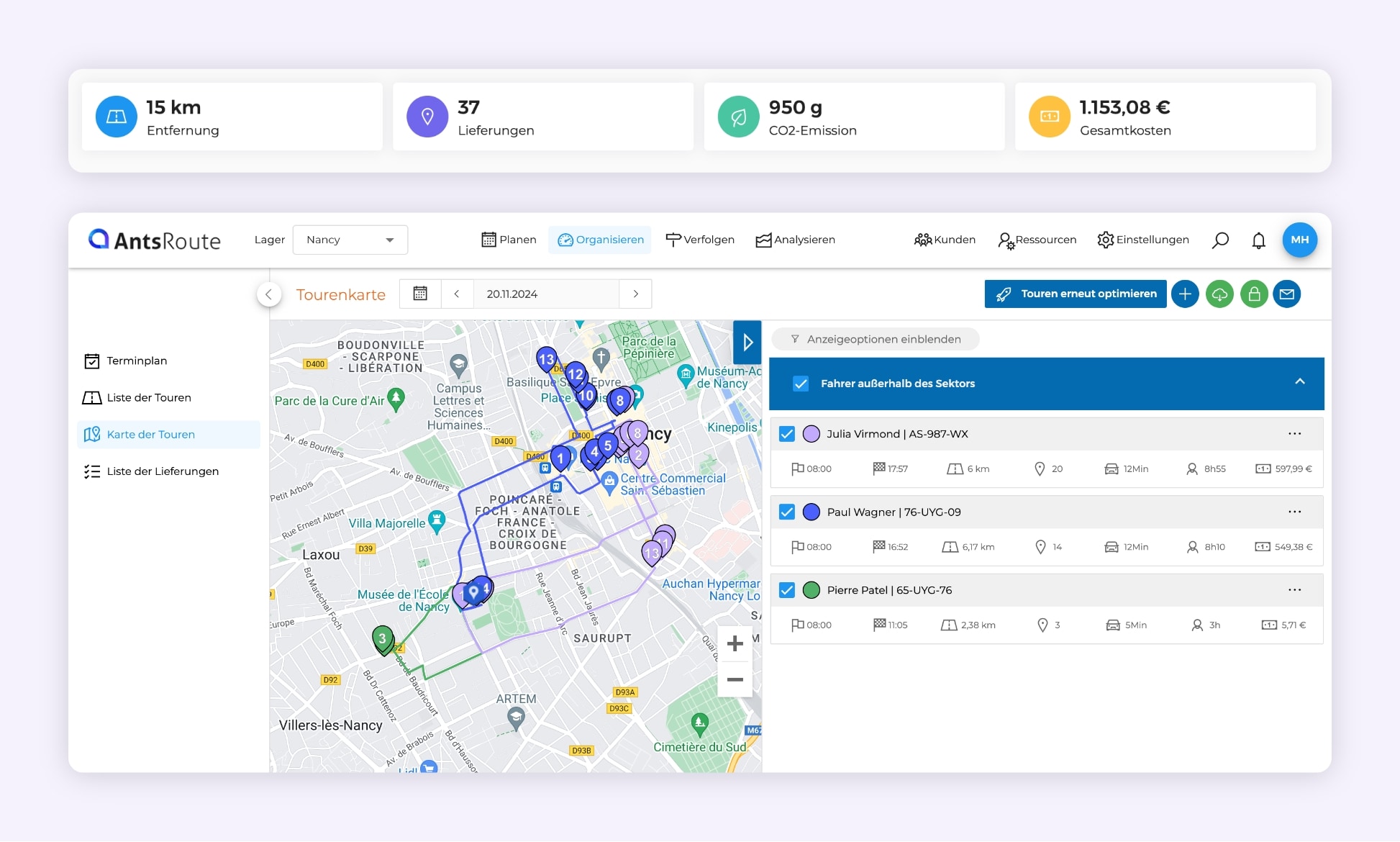 Die Optimierung von Touren ist eines der wirksamsten Mittel zur Senkung der CO₂-Emissionen. Mit Tools wie AntsRoute lassen sich optimale Routen erstellen, die den Verkehr, die CO2-Emissionen, Lieferbeschränkungen und die Fahrzeugkapazität berücksichtigen. Mithilfe dieser fortschrittlichen Algorithmen können Unternehmen Leerrückfahrten reduzieren und die gefahrenen Kilometer begrenzen.