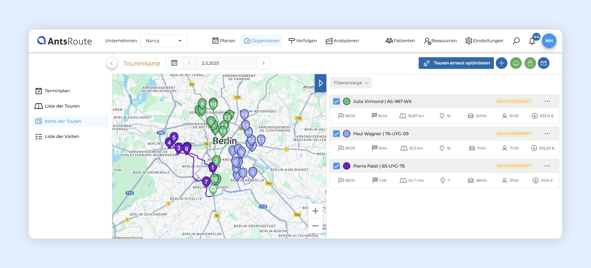 Plattformen wie AntsRoute ermöglichen eine intelligente Routenplanung, bei der Folgendes berücksichtigt wird: Standort der Patienten, bevorzugte Zeiten, geschätzte Dauer der Behandlung, erforderliche Fähigkeiten, Dringlichkeitsgrad usw. Die Routen werden optimiert, die Fahrten reduziert und die Arbeitslast besser verteilt.
