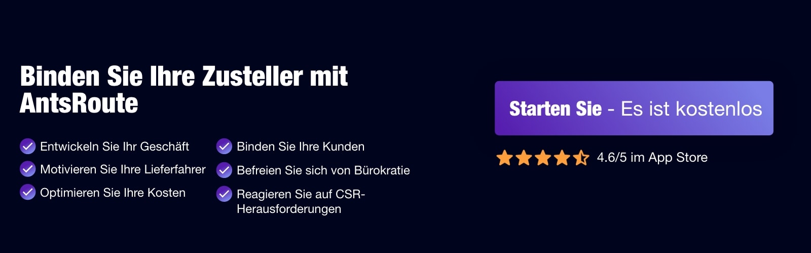 Sie können auf unsere AntsRoute-App sowohl mit einem Android-Smartphone, iPhone oder iPad zugreifen können, diese ist also ein sehr wirksames Instrument, um die täglichen Arbeitsbedingungen Ihrer Fahrer entscheidend zu verbessern und ein mögliches Ausscheiden aus Ihrem Unternehmen zu verhindern. Damit Sie die Vorteile der App 7 Tage lang testen können, bieten wir Ihnen eine kostenlose Testversion an, ohne Verpflichtung oder Kreditkartennummer. Klicken Sie hier, um sich zu registrieren!