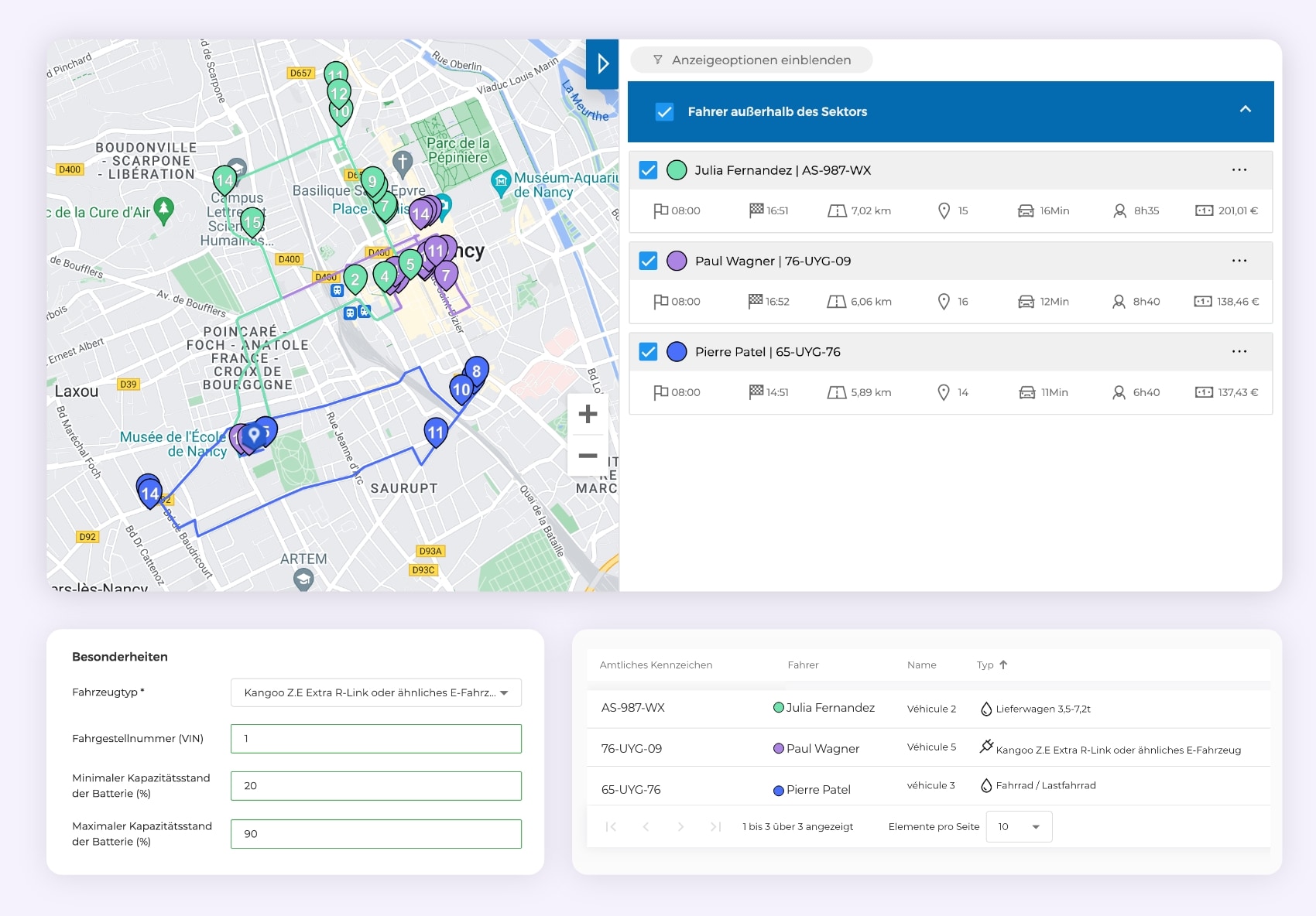 Über die AntsRoute-Benutzeroberfläche werden dann die Fahrpläne auf der Grundlage dieser Informationen erstellt. Wenn Sie beispielsweise den Typ „LKW“ wählen, werden einige Routen geändert, um Verkehrsbeschränkungen oder die Höhe des Fahrzeugs (Tunnel, Brücke usw.) zu berücksichtigen. Auf ähnliche Weise können Sie die maximale Reichweite eines Elektrofahrzeugs einstellen. Die Anwendung berechnet dann die optimale Route anhand der Standorte der Ladestationen.