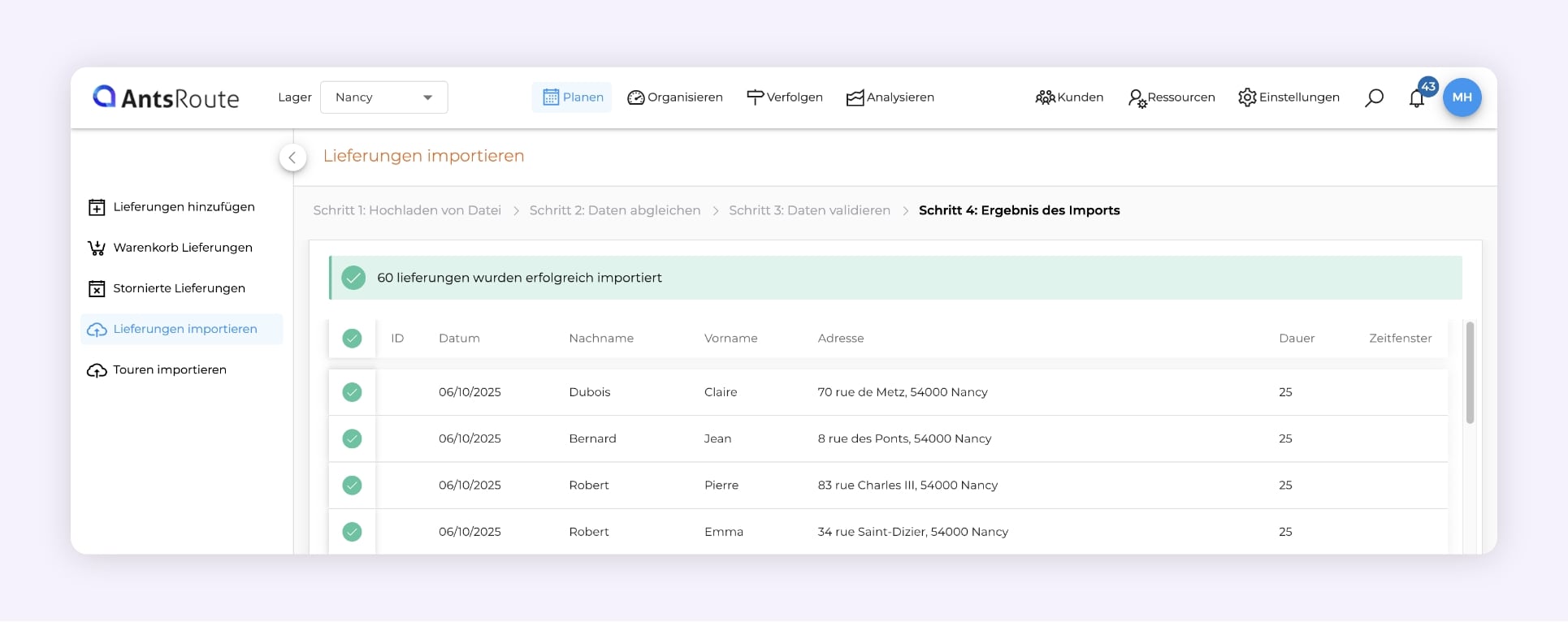 Julie leitet einen Hauslieferdienst für sechs Geschäfte in der Region Lyon. Jeden Morgen importiert sie eine Datei mit 45 bis 50 Lieferungen.