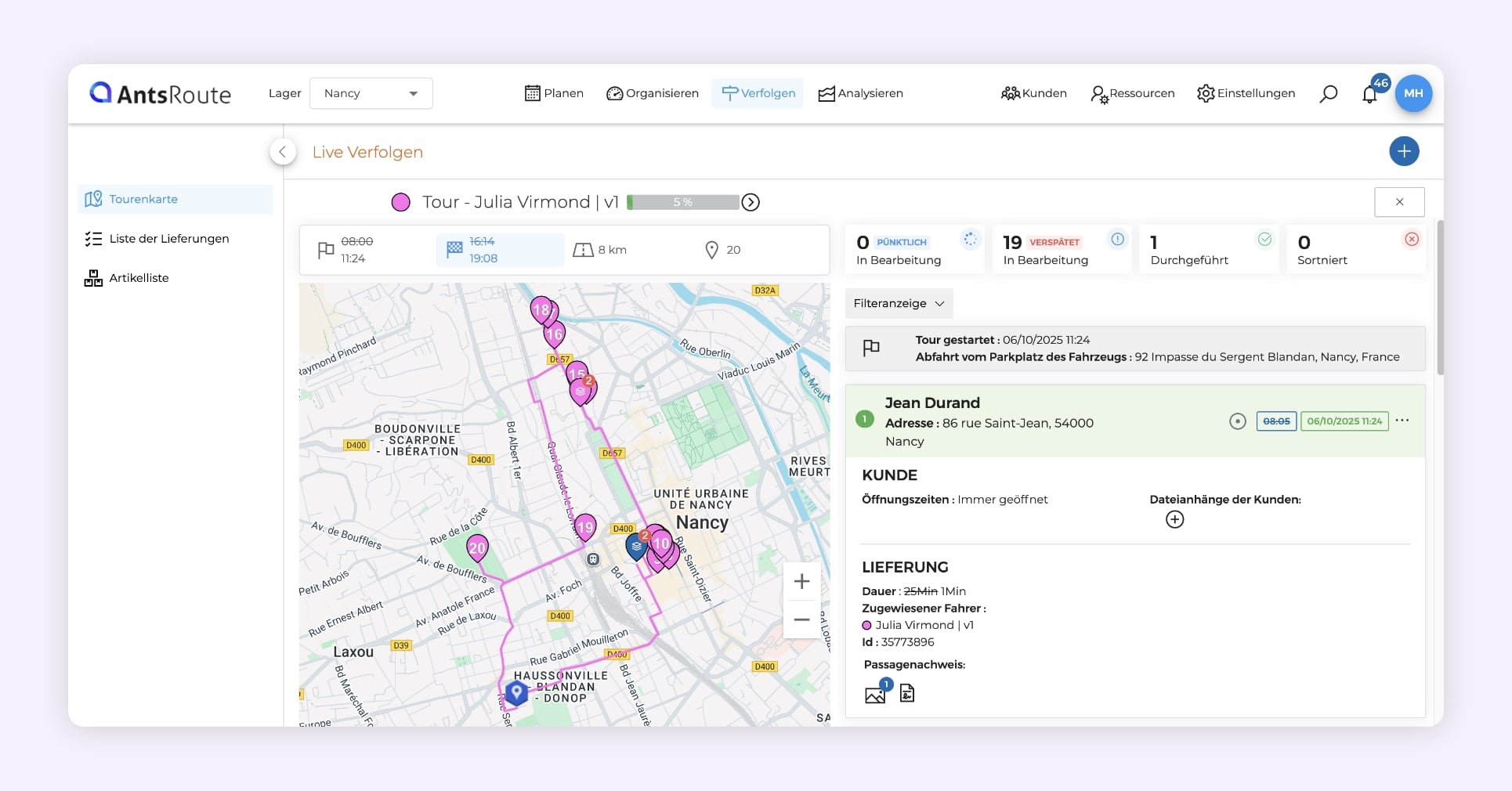 Die Verfolgung einer laufenden Liefertour auf AntsRoute.