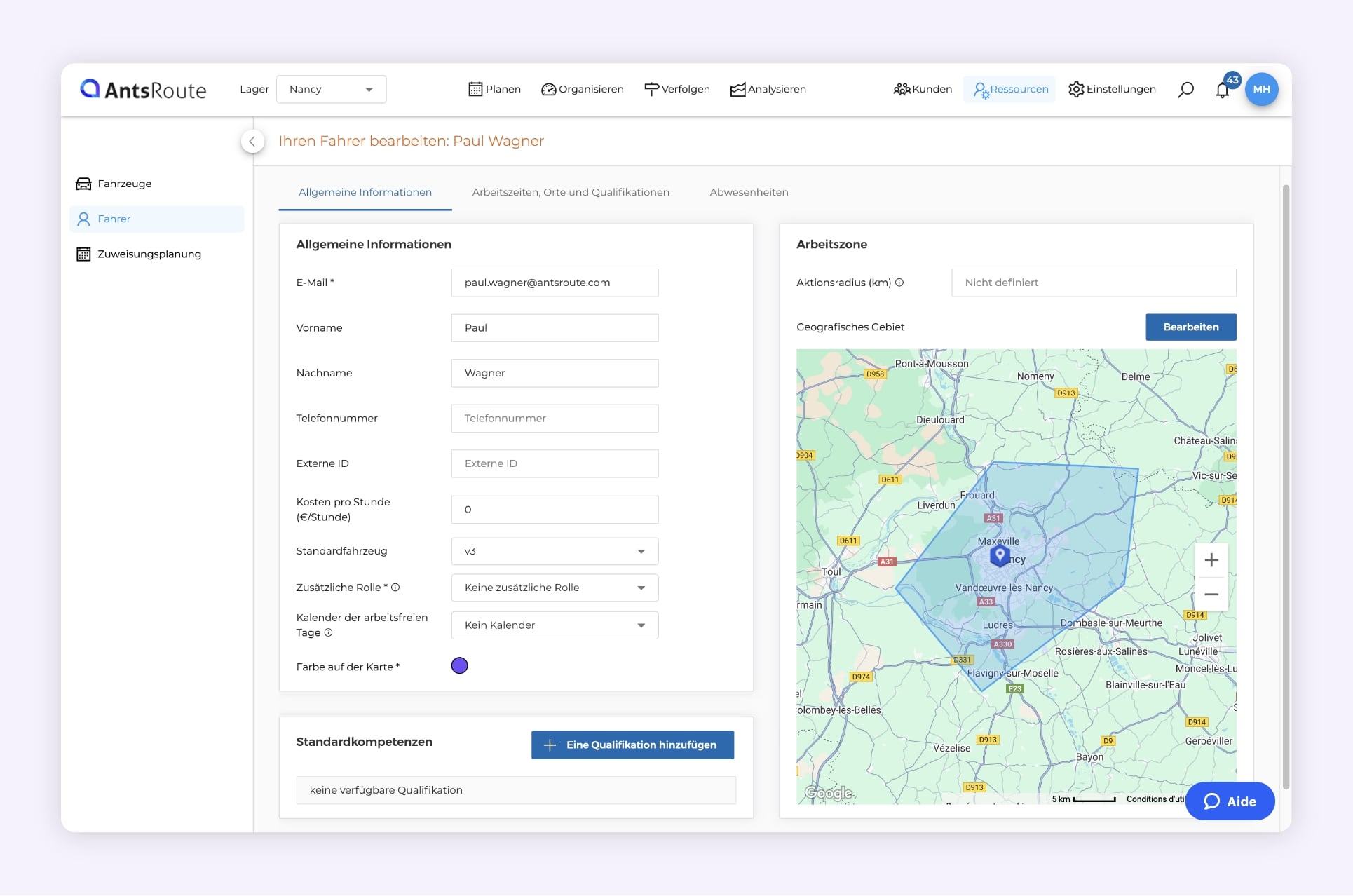 ☝️ Tipp: Erstellen Sie bei Ihren Tests einen Agenten „Demo-Fahrer“ mit Ihrer eigenen E-Mail-Adresse. Damit können Sie sich in die mobile AntsRoute-Anwendung einloggen, als wären Sie der Zustellfahrer.