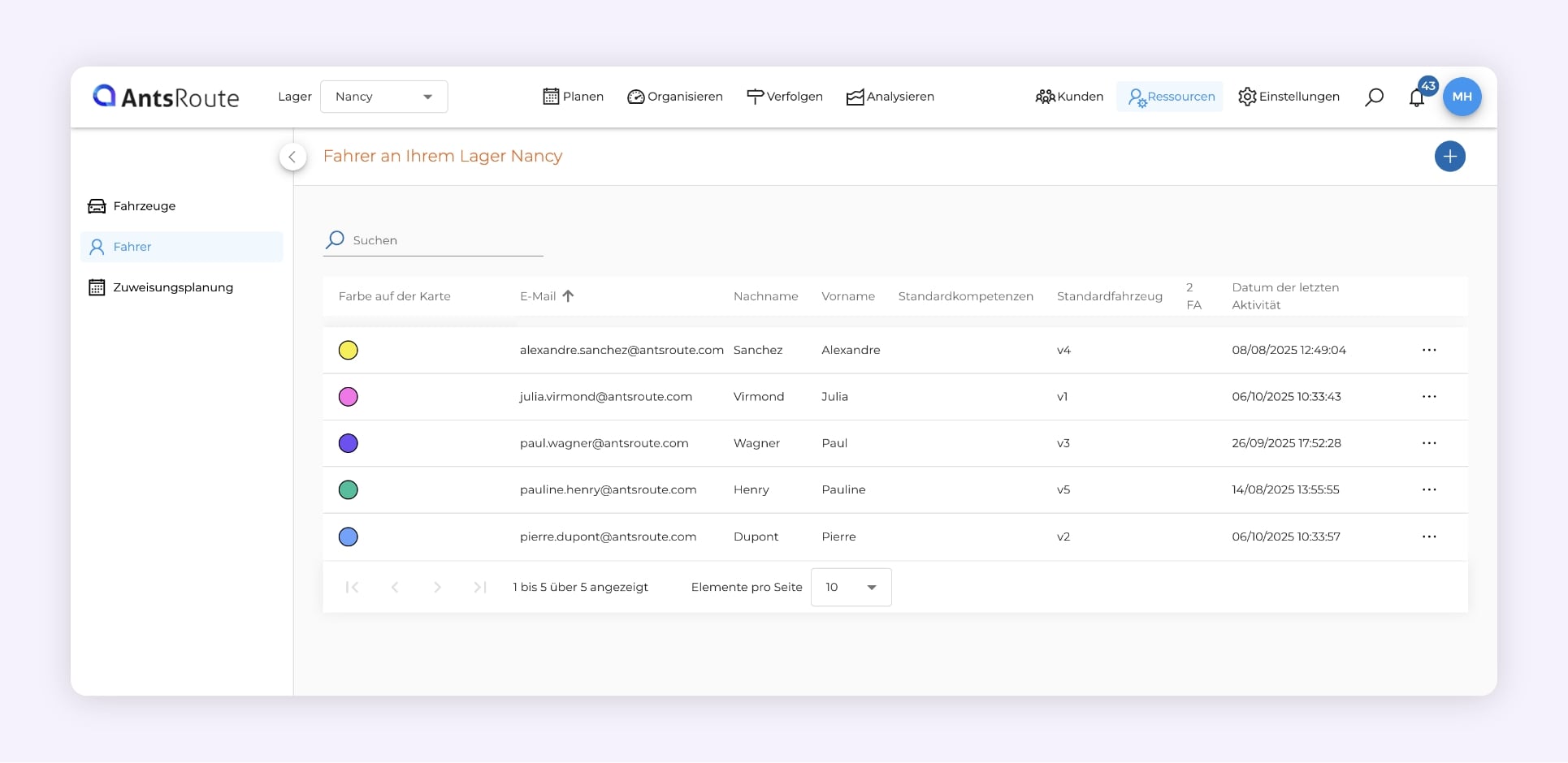 Die Liste der Lieferfahrer auf AntsRoute.