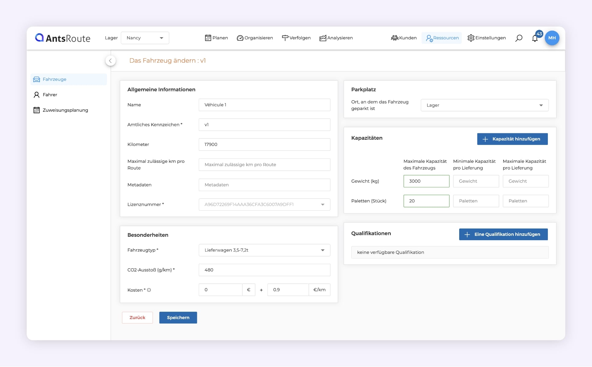 - Ihre Fahrzeuge und deren Kapazitäten festlegen (falls erforderlich);