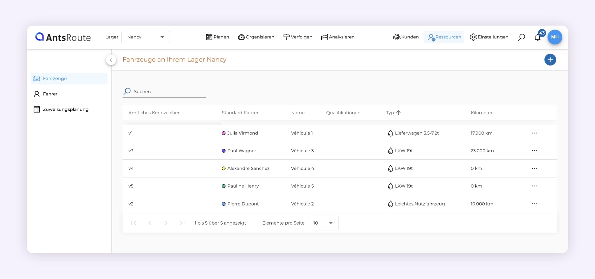 - Klicken Sie im linken Menü auf „Ressourcen“ > „Fahrer“.