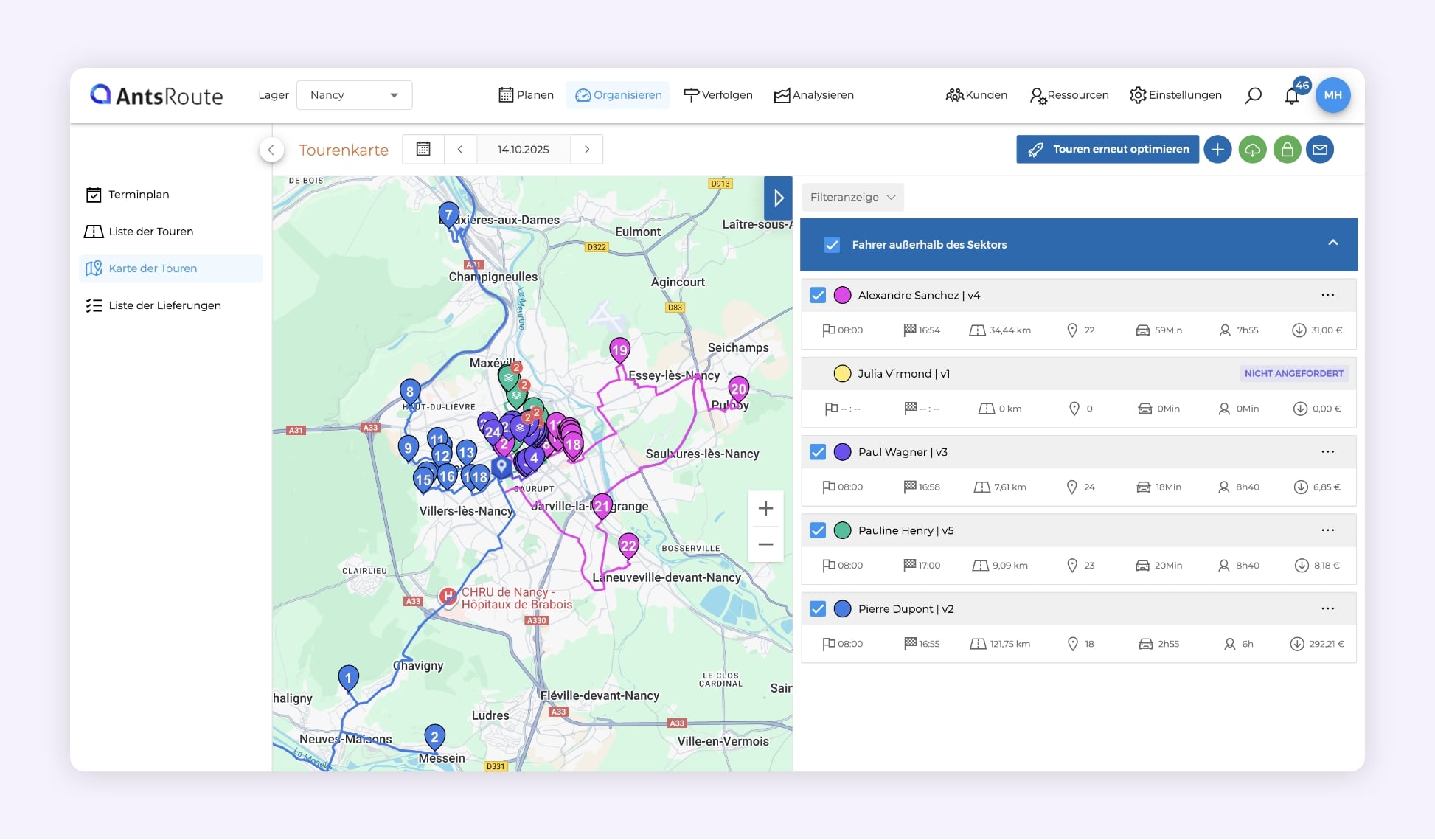 - Die Touren werden jeden Tag automatisch generiert, wobei Gewicht, Volumen und Kundenzeitfenster berücksichtigt werden;