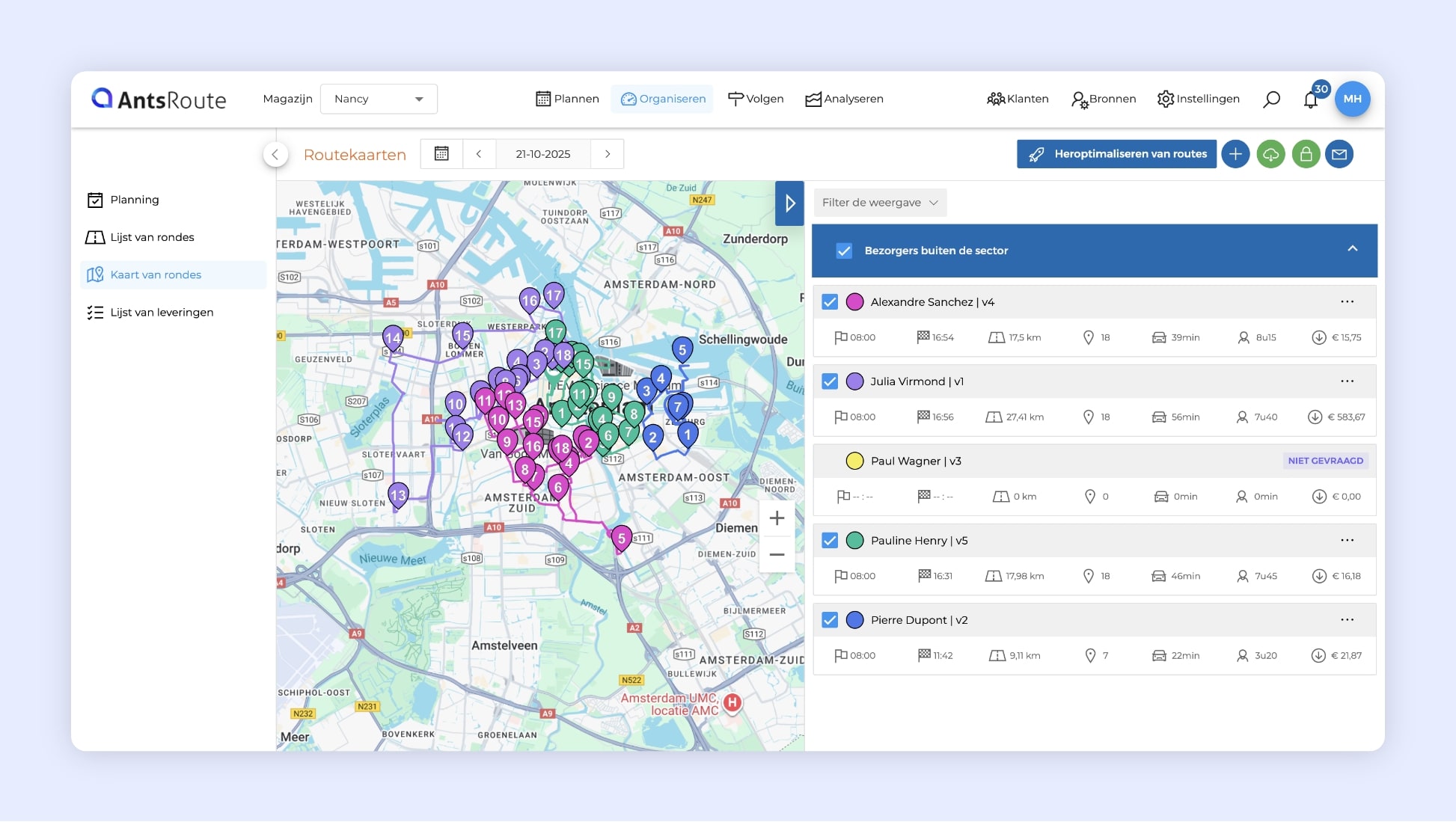 - Sie planen und optimieren die Tour in einer dedizierten Software (um Einschränkungen, Prioritäten, Zeitfenster usw. zu verwalten).