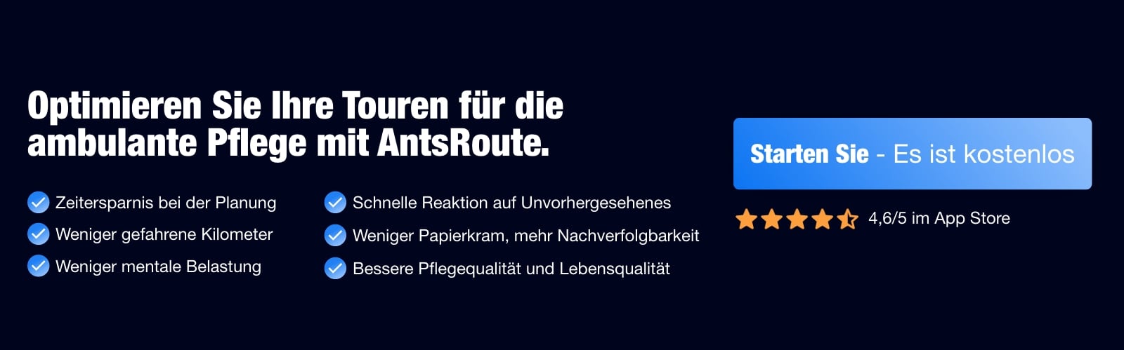 Wenn Sie auf der Suche nach einer speziell für Ihre Branche entwickelten Softwarelösung für die ambulante Pflege sind, lohnt sich ein genauer Blick auf AntsRoute. Sie können AntsRoute 7 Tage lang kostenlos testen!