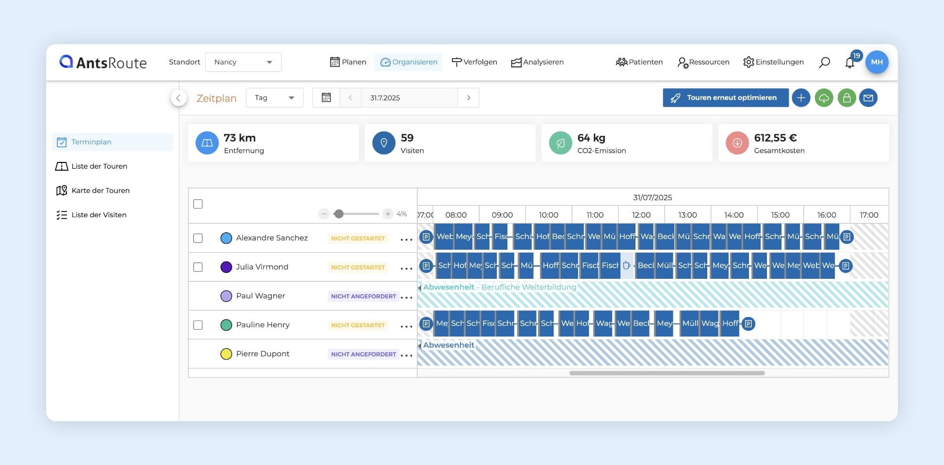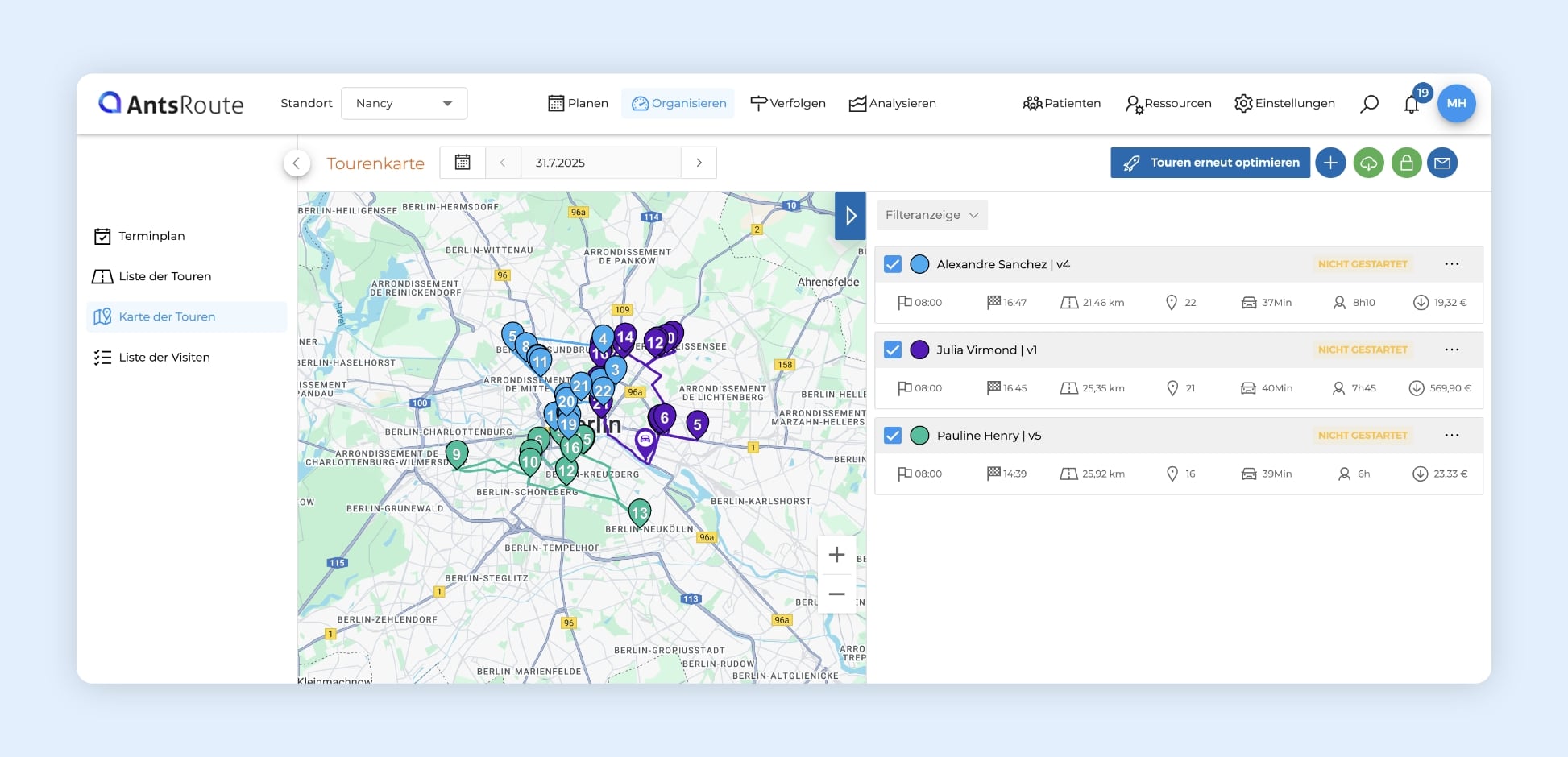 • ✅ Und schwupps: Die Patienten werden der richtigen Person zugewiesen – je nach geografischer Nähe und Art der Pflege. AntsRoute generiert automatisch die optimalen Touren.