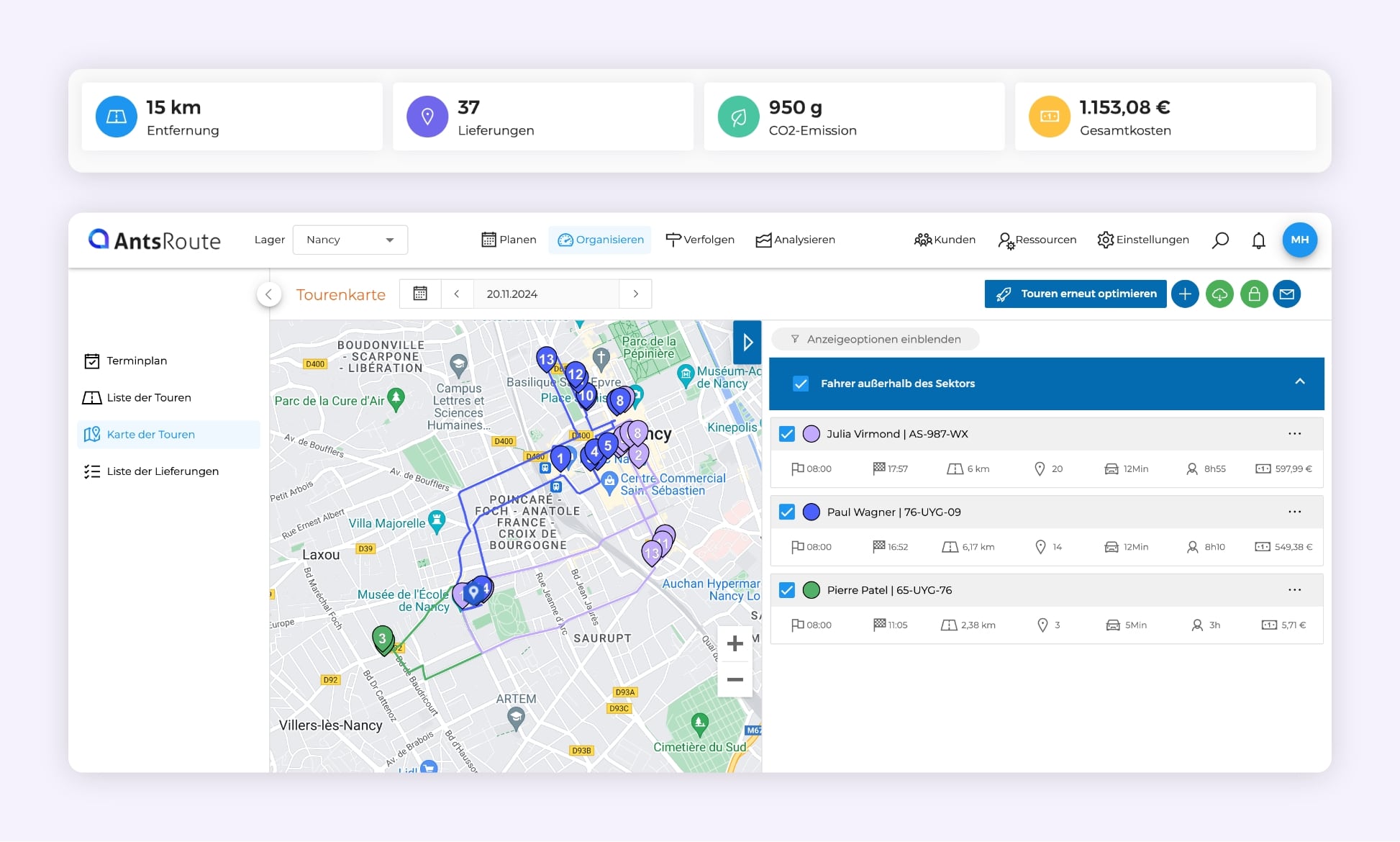 - Kostenanalyse: Lösungen wie AntsRoute berechnen in Echtzeit die Kosten der Touren und zeigen Optimierungsmöglichkeiten auf.
