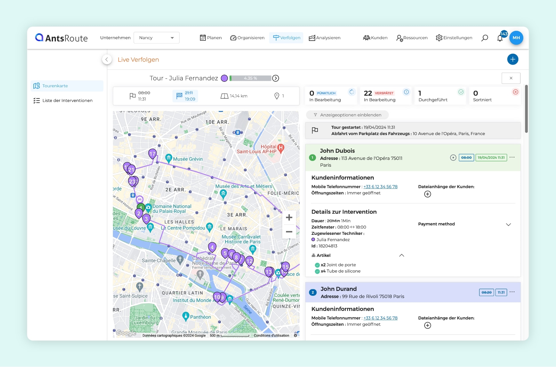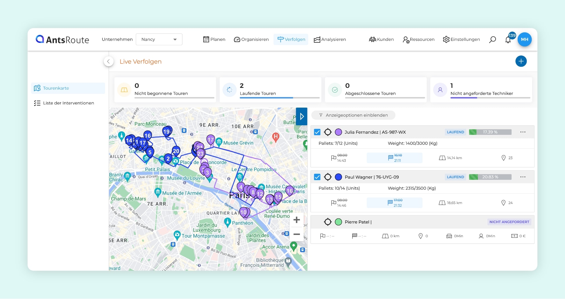 Die Live-Verfolgung einer Tour von Interventionen auf AntsRoute.