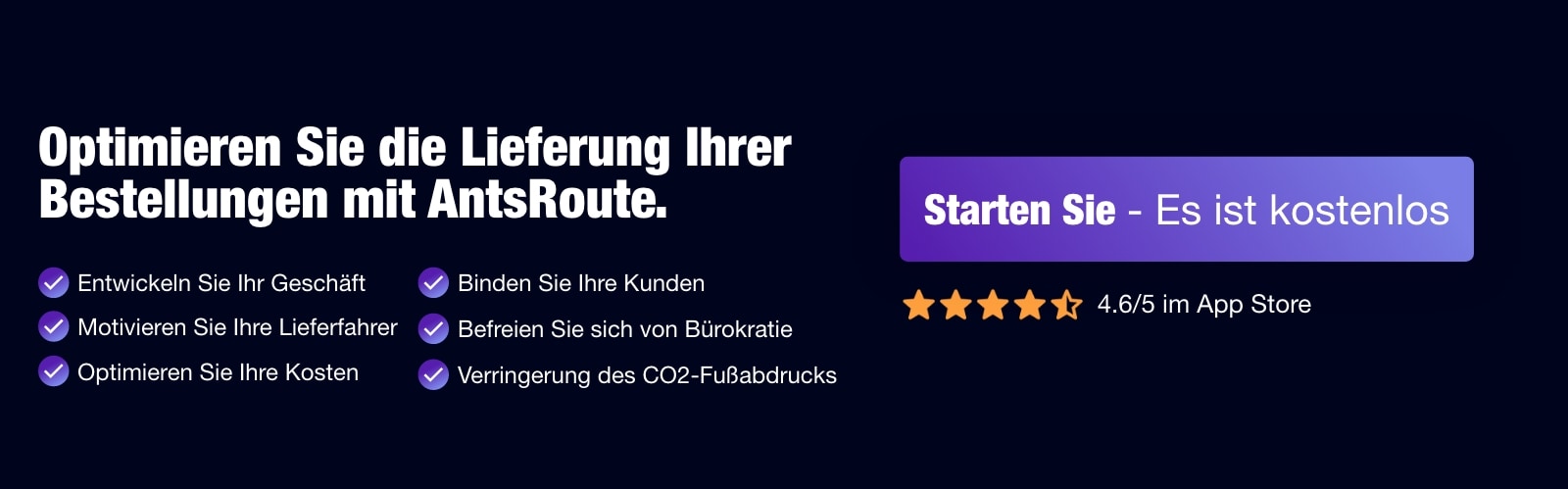 Mit dem weiteren Wachstum des Online-Handels wird das Zustellungsmanagement für die letzte Meile zu einem entscheidenden Erfolgsfaktor. Die Herausforderung besteht darin, die Lieferarten zu optimieren und gleichzeitig ein Gleichgewicht zwischen den Kosten und der Liefergeschwindigkeit herzustellen. Durch die Optimierung dieses Prozesses können Sie nicht nur die logistische Effizienz, sondern auch die Kundenzufriedenheit steigern. AntsRoute ist Ihr Verbündeter, um jede Lieferung reibungslos und erfolgreich zu gestalten und so Ihre Marktposition zu stärken.