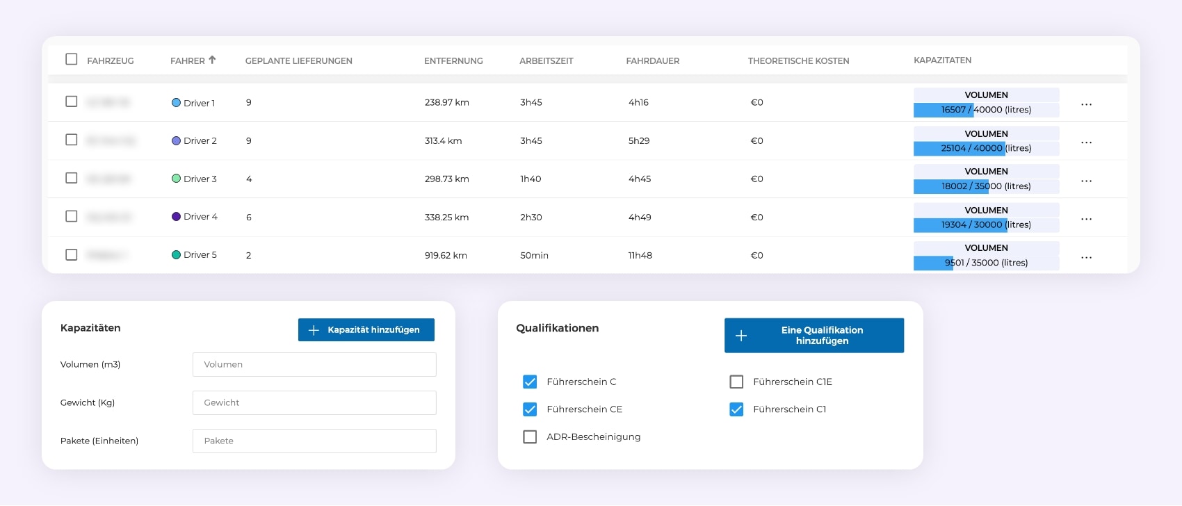 • Verfügbarkeiten und Auslastung jedes Fahrers usw.