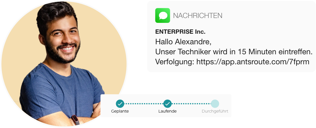 Ein Benachrichtigungssystem mit einem Geotracking-Link, der es den Kunden ermöglicht, den Techniker live auf einer Karte zu verfolgen.