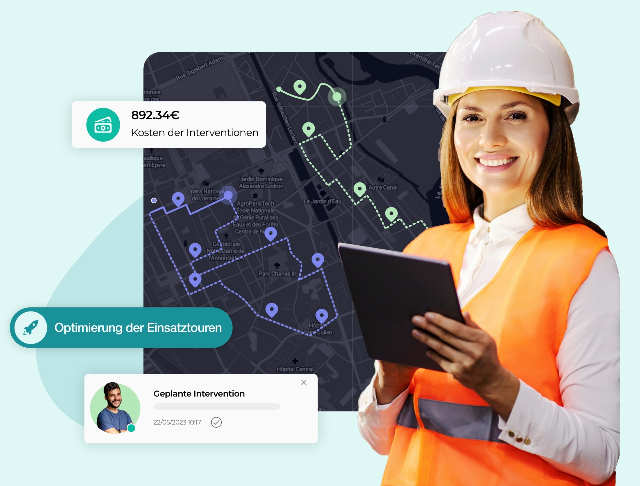 - Visualisierung der Routen jedes Technikers auf einer Karte.