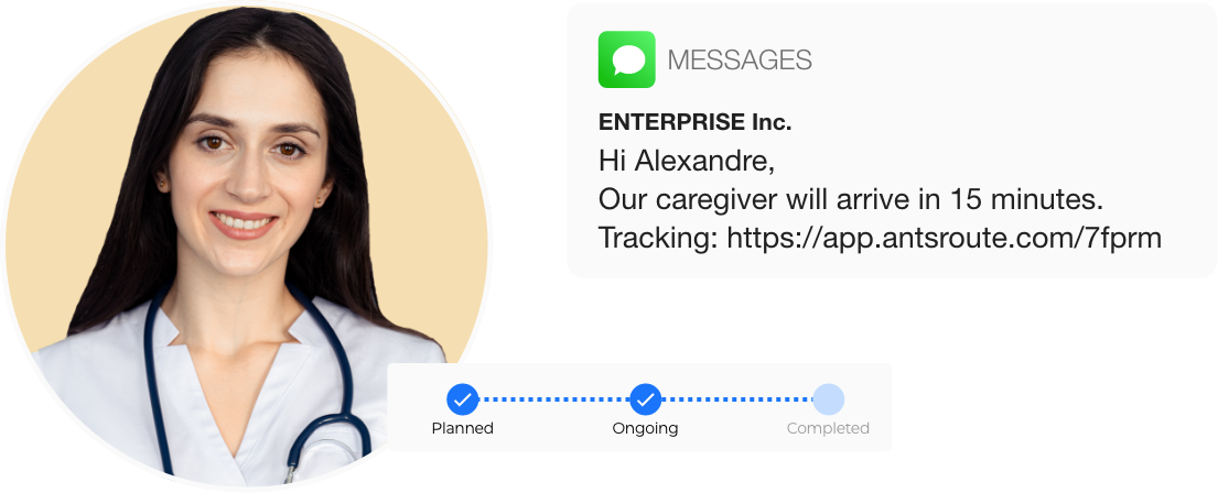 A notification system with a tracking link enabling the patient to follow the caregiver’s progress live on a map.