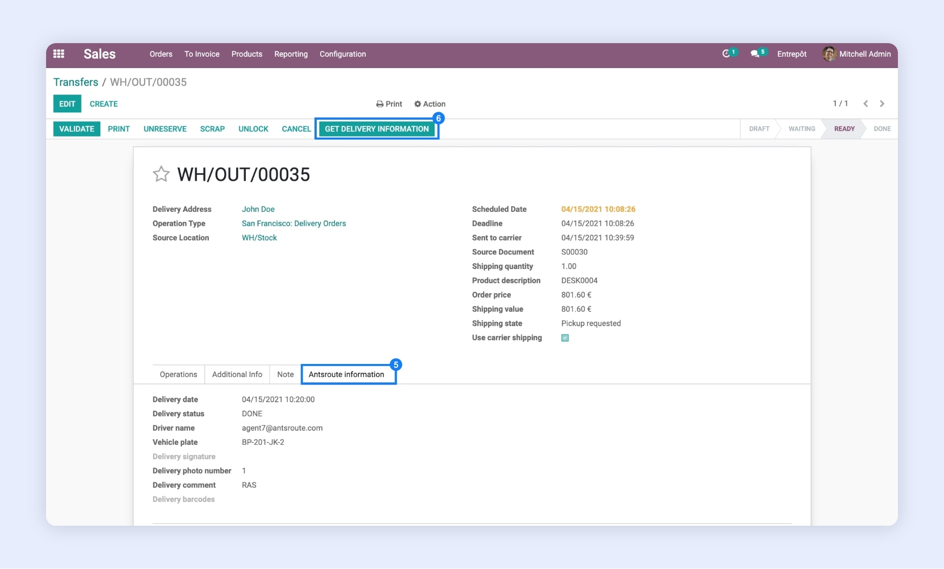 Here is the information sent from AntsRoute to your Odoo account:
