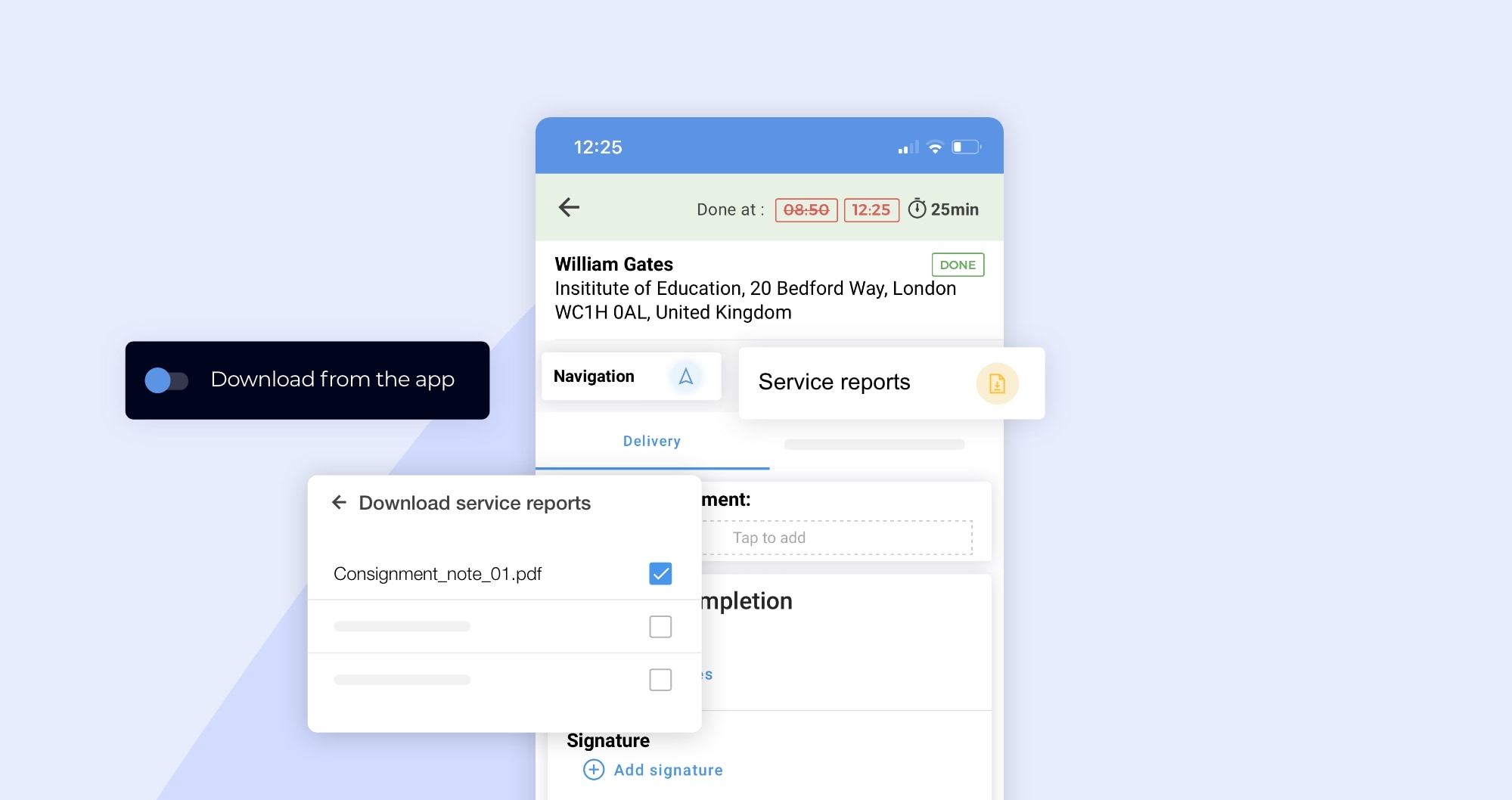 Step 3: Once your delivery drivers start their routes, they can now download the consignment note in PDF format for each delivery step. They just have to display the details of a delivery and click on the “Reports” button. From this page, your driver just needs to select the documents to be downloaded. And it’s done!