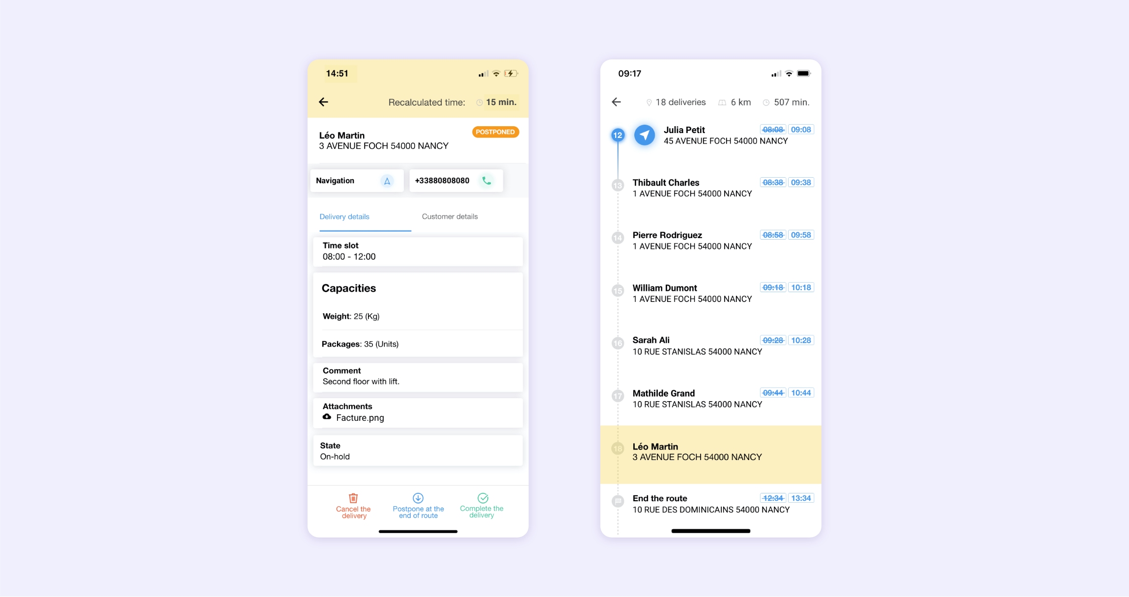 Step 1: From the mobile application, the worker displays the details of the required step, then clicks on the “Postpone to end of route” button.