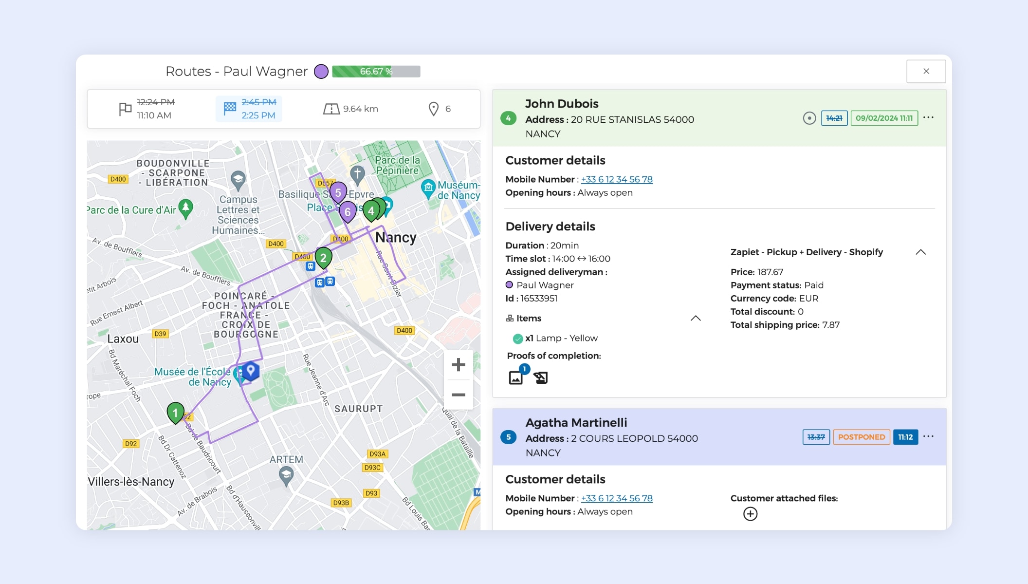 The tool plans a first stop to pick up the goods at your shop’s address, then a second stop to deliver them to your customer’s address.
