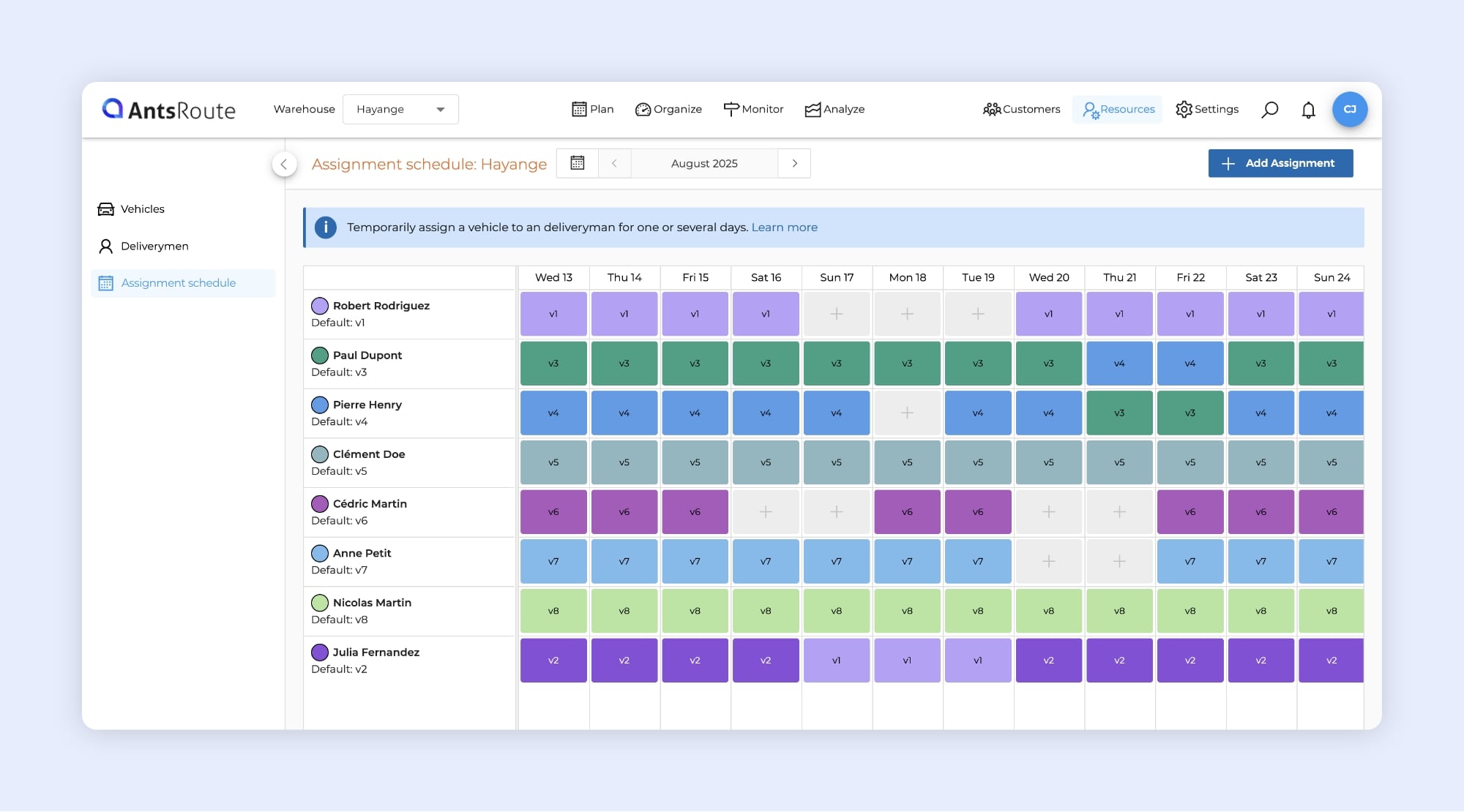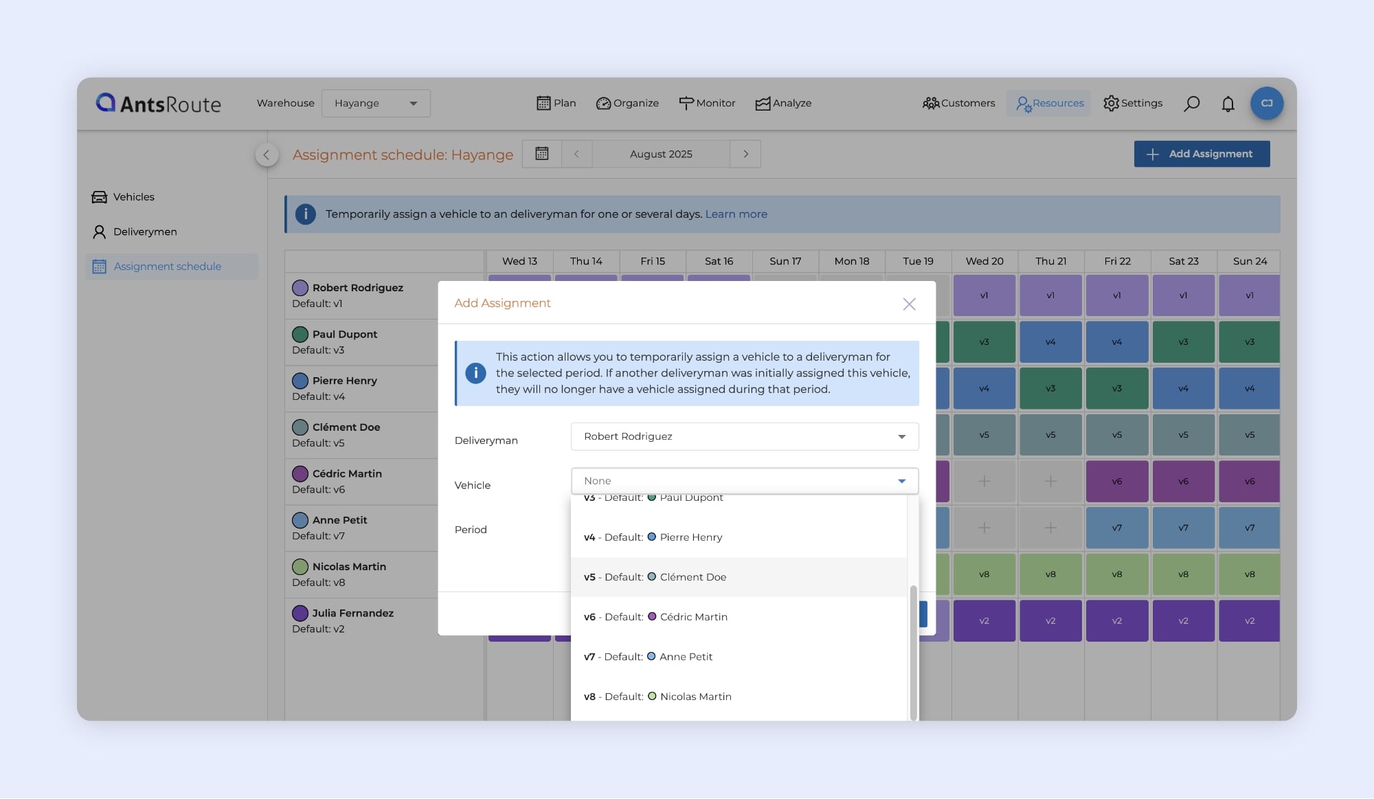 ⚠️ Important: When a vehicle is reassigned to another driver for a given period, the original driver will not have any vehicle assigned during that time. If a route is scheduled for them, it will be automatically unscheduled.