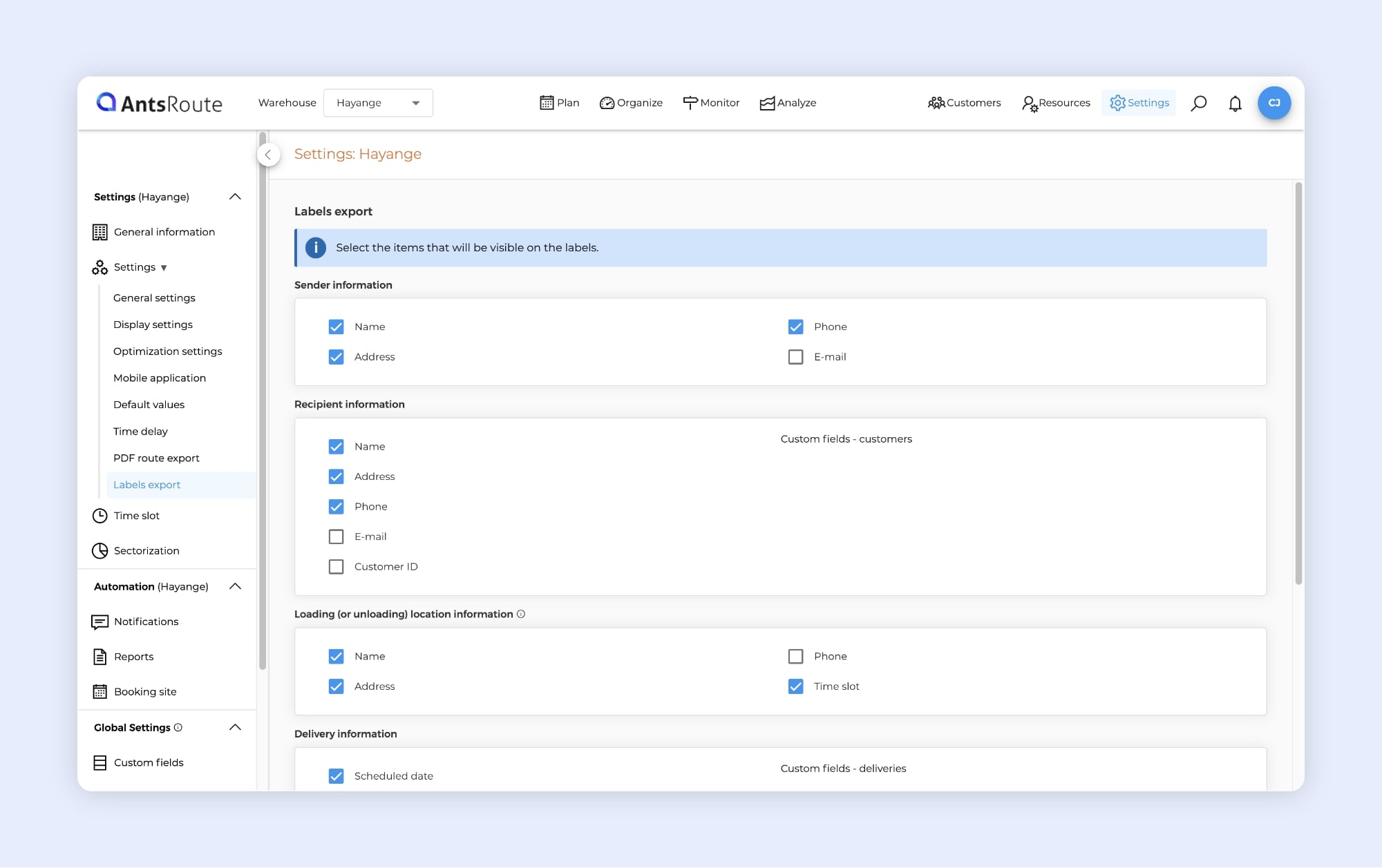 • Download and customize your package labels directly in AntsRoute