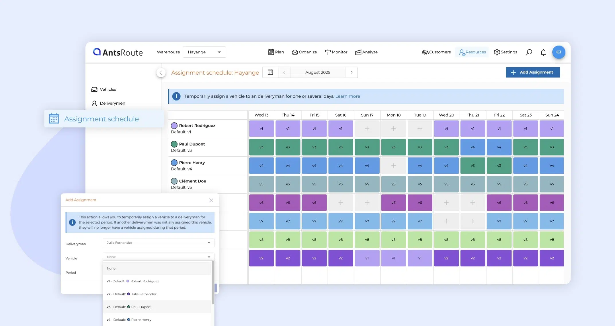 ⚠️ Important: When a vehicle is reassigned to another driver for a given period, the original driver will not have any vehicle assigned during that time. If a route is scheduled for them, it will be automatically unscheduled.