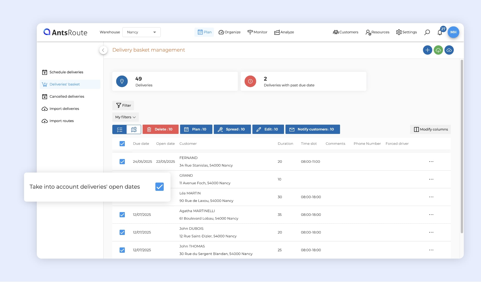 - Go to, for example, Plan > Deliveries’ Basket.