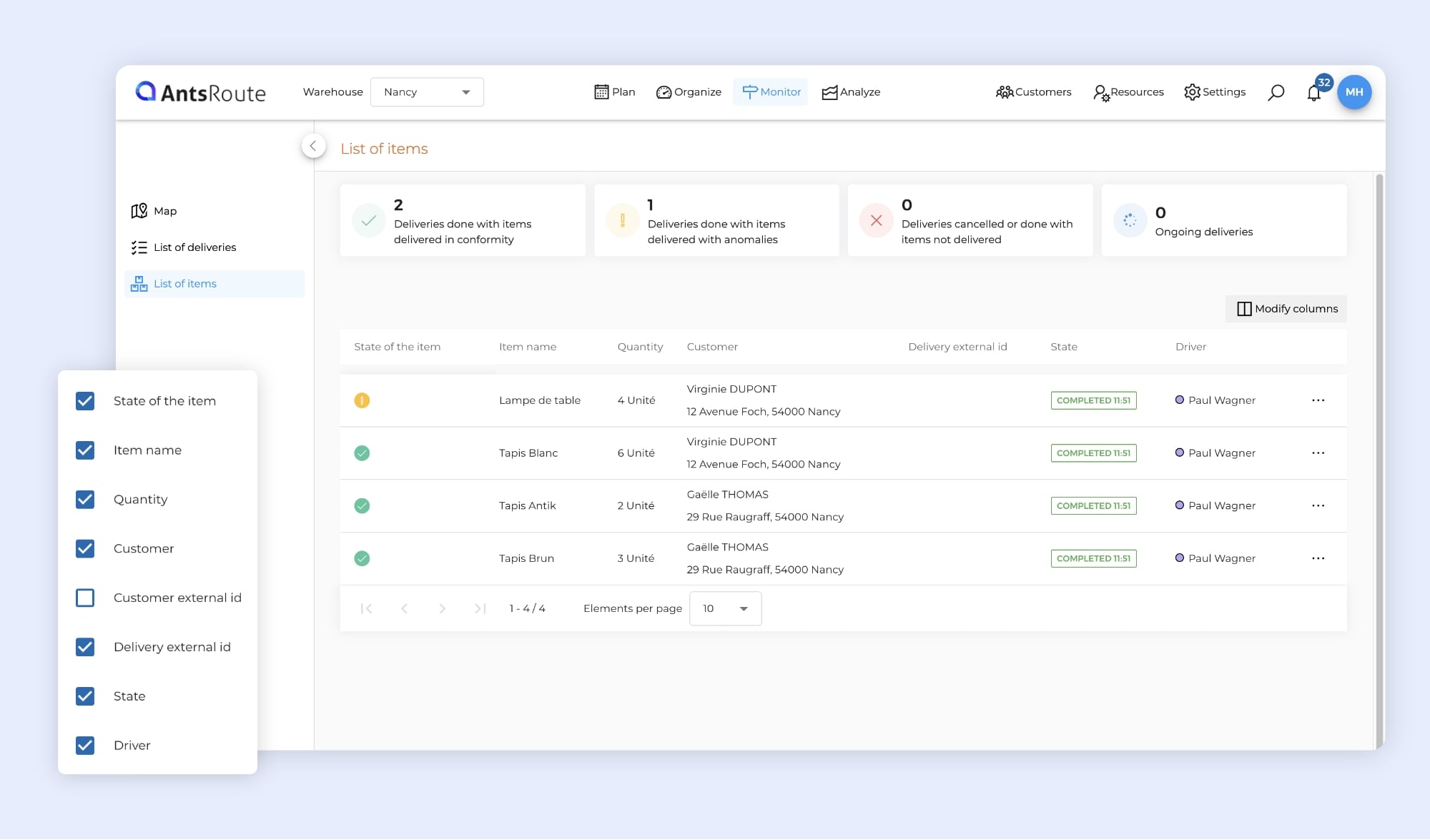 AntsRoute’s item database already allows you to manage all the products delivered during your routes. With this feature, your drivers know exactly what quantities to deliver to each customer, at every stop.