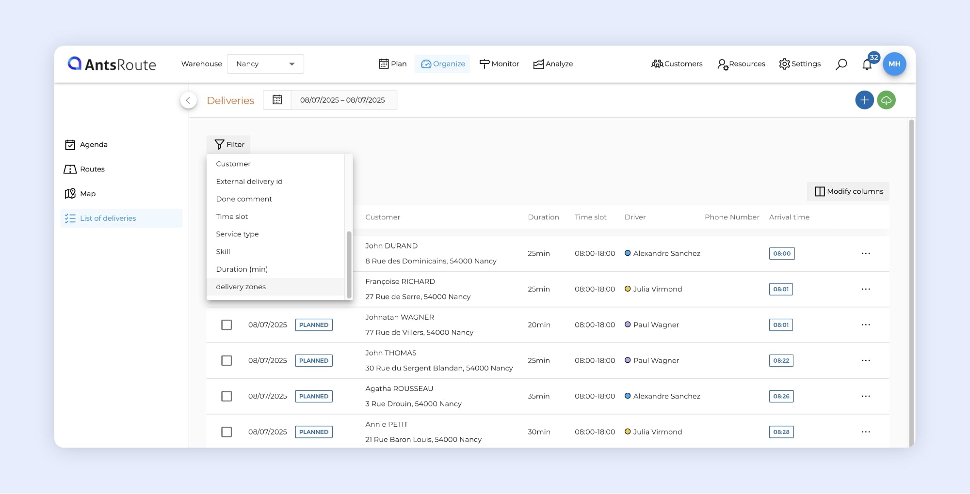 Using a delivery zone filter in the delivery table on AntsRoute.