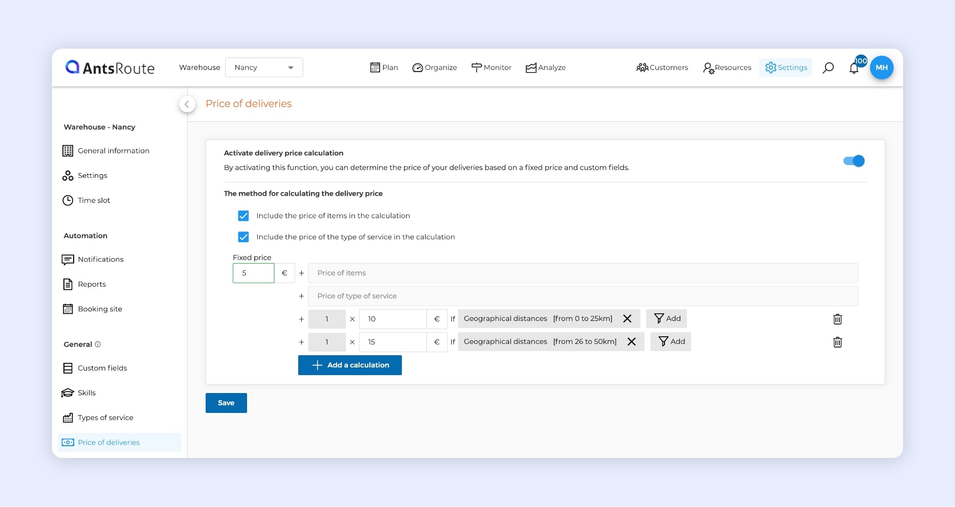 From your AntsRoute account, go to “Settings” > “Price of work orders”. From this page, enable the “Activate work order price calculation” function.
