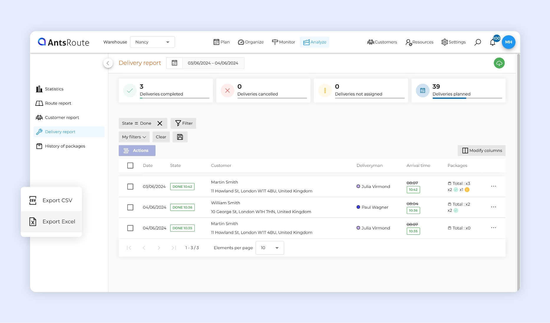 A new function has just been added: retrieve the list of packages from export files. If you export files (Excel or CSV) of your routes or deliveries from the analysis module, you can now access a “Packages” column. In this column, you can view the parcel reference for each delivery.