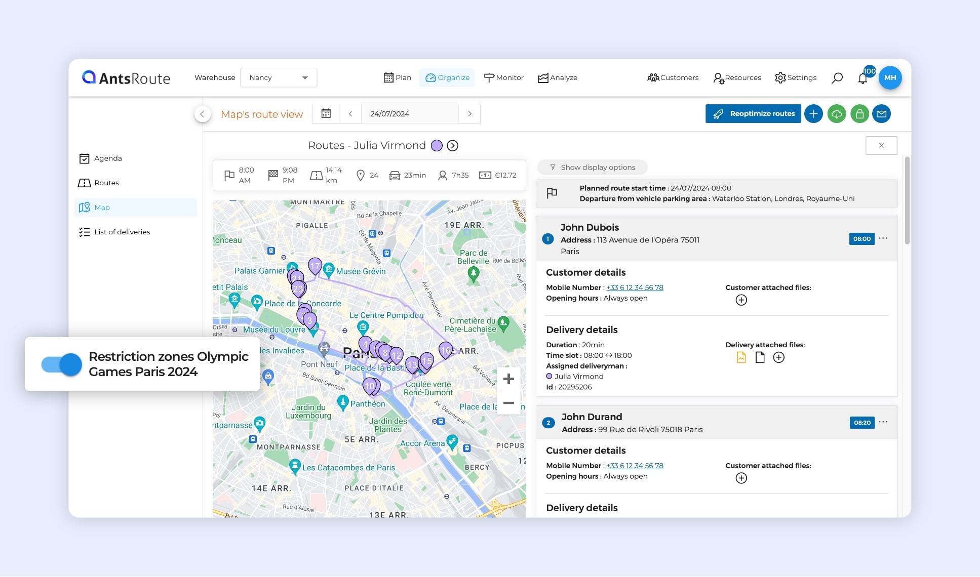 Here’s a new feature that’s been particularly eagerly awaited by our users in Paris: the exclusion of areas where the Paris 2024 Olympic Games will be taking place. In practical terms, when optimising your routes, AntsRoute avoids areas where Olympic events are scheduled. Thanks to this new setting, you can be sure of meeting your delivery or service deadlines throughout the period of this major event. Field staff and delivery drivers can get on with their work in complete peace of mind.
