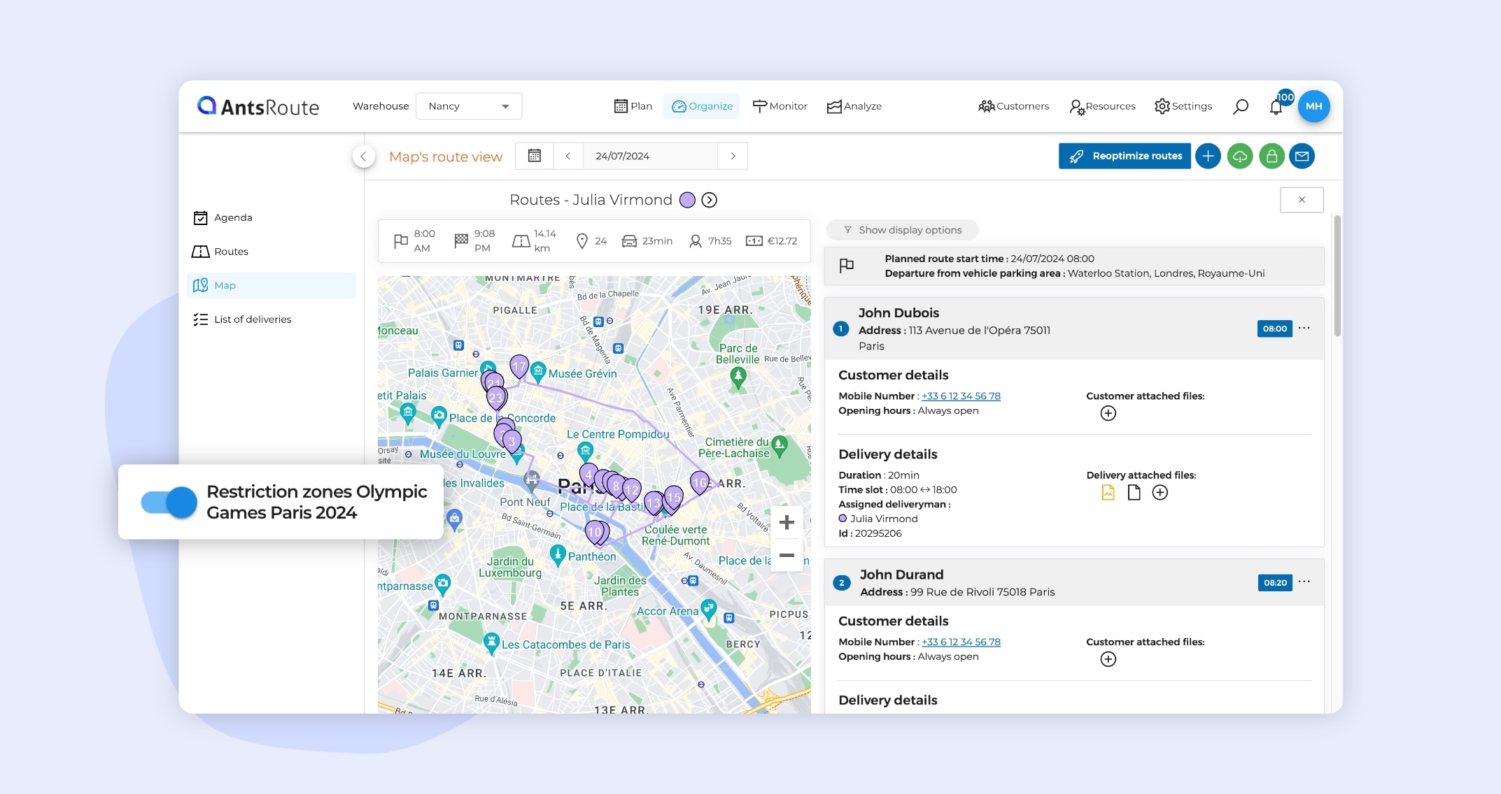 Here’s a new feature that’s been particularly eagerly awaited by our users in Paris: the exclusion of areas where the Paris 2024 Olympic Games will be taking place. In practical terms, when optimising your routes, AntsRoute avoids areas where Olympic events are scheduled. Thanks to this new setting, you can be sure of meeting your delivery or service deadlines throughout the period of this major event. Field staff and delivery drivers can get on with their work in complete peace of mind.