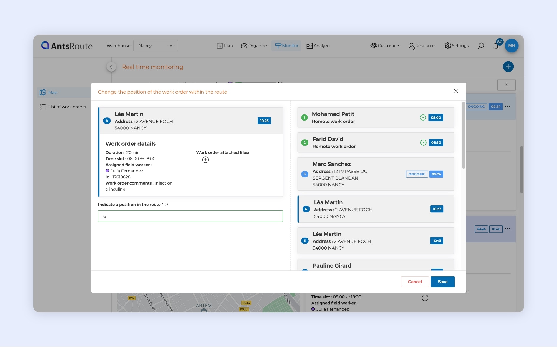 Go to the “Monitor” module > “Map”. Display your driver’s route from the panel on the right. Identify the work order and click on “…” > “Reposition”. All you have to do now is enter the new position (positive integer) of this order in the route.