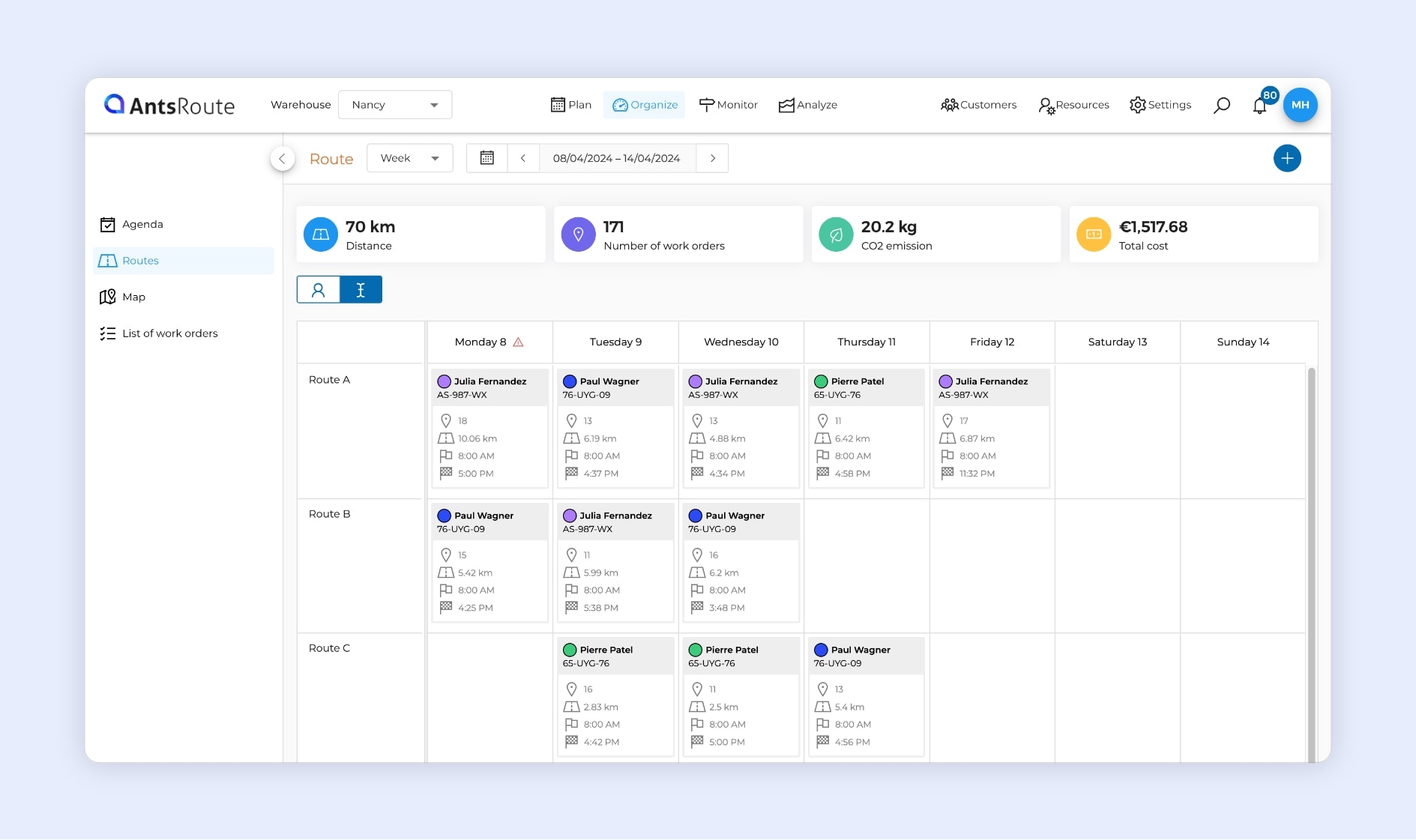 For several months now, AntsRoute has been giving you access to a weekly view of your routes, with a display by driver. To meet the needs of our customers who make regular routes and use our function to name routes, we have just added a new function. You can now access a weekly view of your routes, with a display by route name.